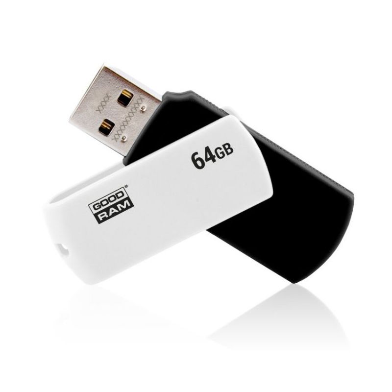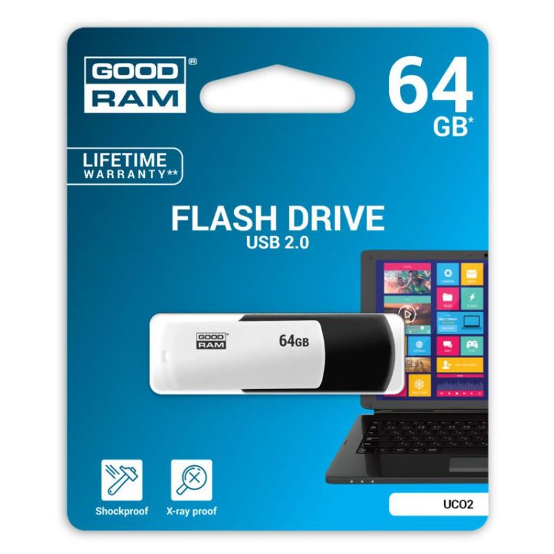 Descripción Goodram UCO2. Capacidad: 64 GB, Interfaz del dispositivo: USB tipo A, Versión USB: 2.0, Velocidad de lectura: 20 MB/s, Velocidad de escritura: 5 MB/s. Factor de forma: Girar. Peso: 8 g. Color del producto: Negro, Blanco