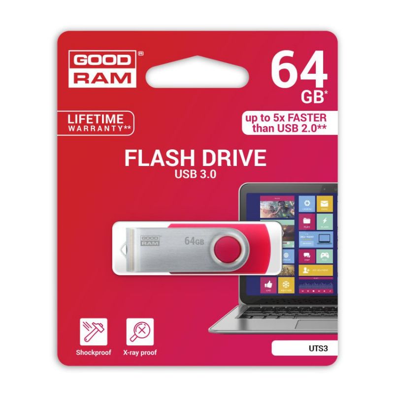 Descripción Goodram UTS3. Capacidad: 64 GB, Interfaz del dispositivo: USB tipo A, Versión USB: 3.2 Gen 1 (3.1 Gen 1), Velocidad de lectura: 60 MB/s, Velocidad de escritura: 20 MB/s. Factor de forma: Girar. Peso: 15 g. Color del producto: Rojo