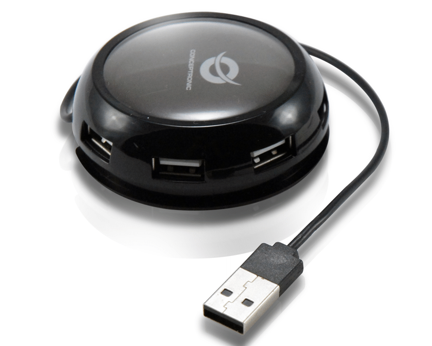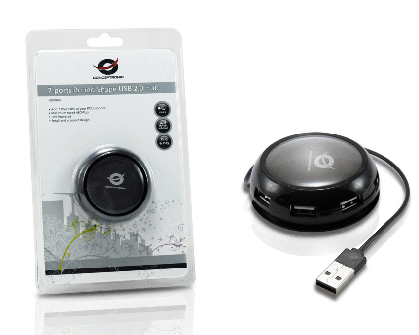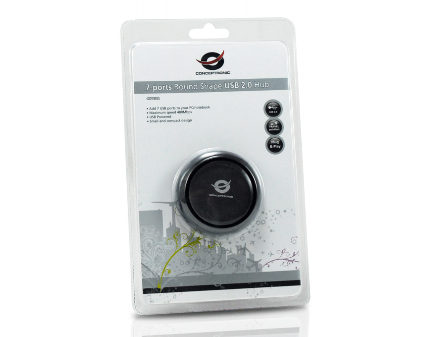 Gracias a su diseño pequeño y compacto, este 7-puertos de forma redonda USB 2.0 Hub es la solución ideal para viajar! Diseño Compacto Con Alimentador Externo
