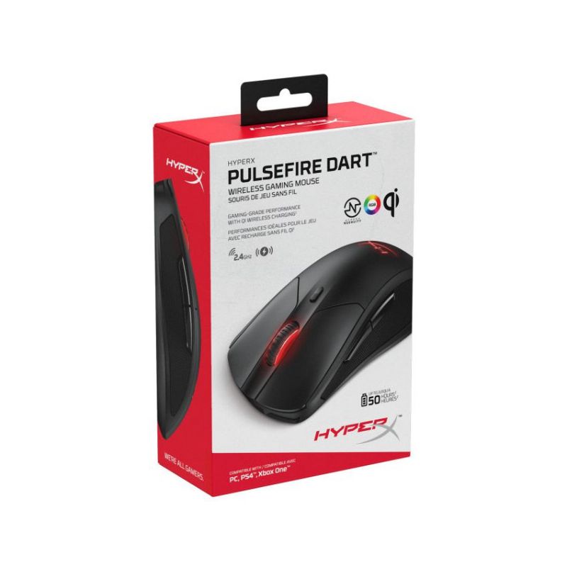 Descripción HyperX Pulsefire Dart. Factor de forma: mano derecha. Tecnología de detección de movimientos: Óptico, Interfaz del dispositivo: RF inalámbrico, Resolución de movimiento: 16000 DPI, Tipo de botones: Botones presionados, Cantidad de botones: 6, Tipo de desplazamiento: Rueda, Aceleración (máx.): 50 G. Iluminación de color: Multi. Fuente de energía: Baterías/Cable. Color del producto: Negro