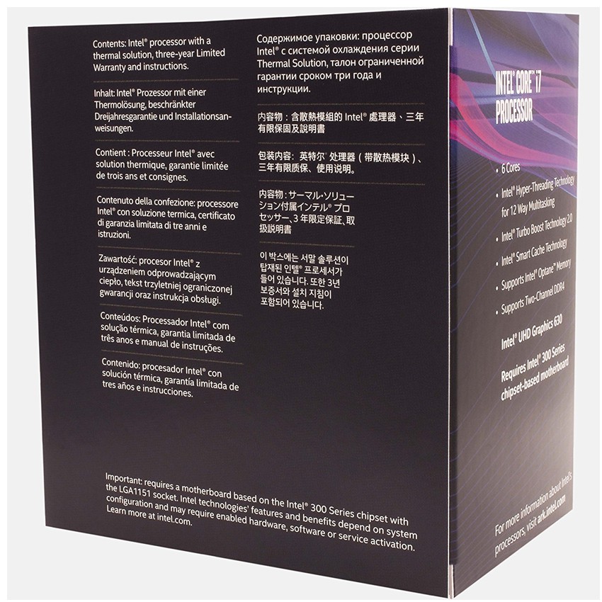Descripción Intel Intel® Core? i7-8700 Processor (12M Cache, up to 4.60 GHz), Core. Familia de procesador: 8ª generación de procesadores Intel® Core? i7, Frecuencia del procesador: 3,2 GHz, Socket de procesador: LGA 1151 (Socket H4). Canales de memoria que admite el procesador: Dual, Memoria interna máxima que admite el procesador: 64 GB, Tipos de memoria que admite el procesador: DDR4-SDRAM. Modelo de gráficos en tarjeta: Intel UHD Graphics 630, Salidas de adaptador de gráficos compatibles a bordo: DisplayPort,Embedded DisplayPort (eDP),HDMI, Frecuencia base de gráficos a bordo: 350 MHz. Potencia de diseño térmico (TDP): 65 W, Configuraciones PCI Express: 1x16,1x8+2x4,2x8, Set de instrucciones soportadas: AVX 2.0,SSE4.1,SSE4.2. Memoria interna máxima: 65536 MB