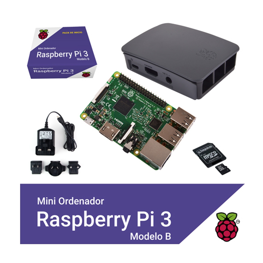 Kit de iniciación compuesto por: Raspberry Pi 3 modelo B, MicroSD 8GB con S.O.