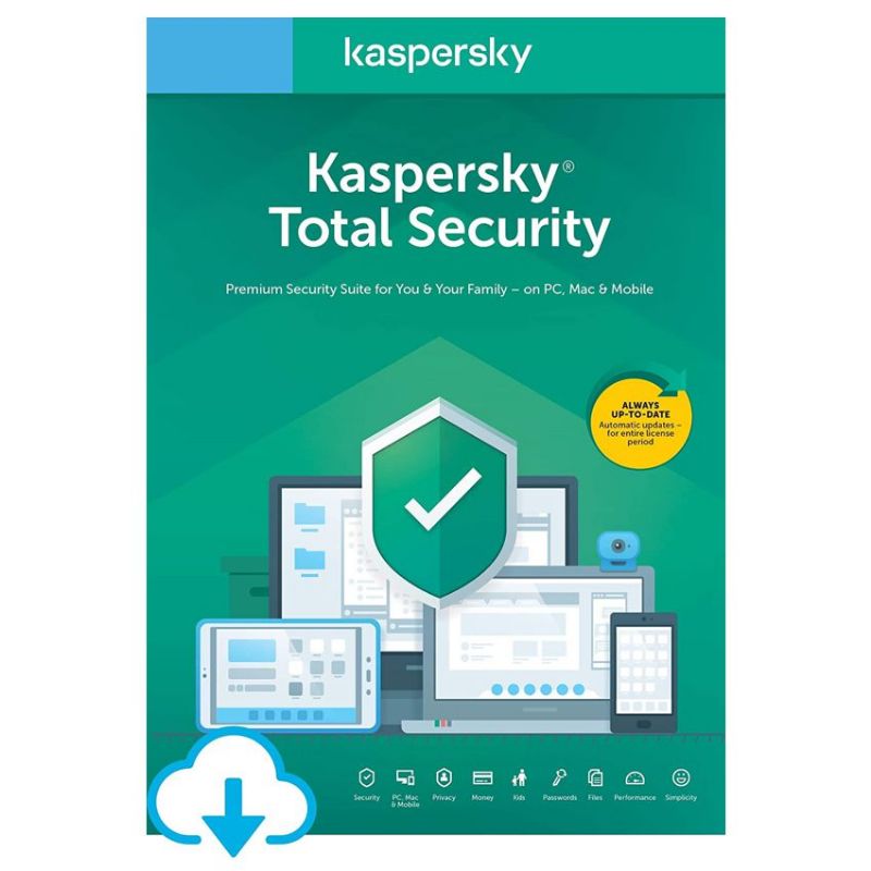 Descripción Kaspersky Lab Kaspersky Antivirus Total Security 2020. Cantidad de licencia: 1 licencia(s), Número de años: 1 año(s), Tipo de licencia: Licencia completa. Espacio mínimo de almacenamiento del disco: 1500 MB, RAM mínima: 1024 MB. Tipo de software: Caja