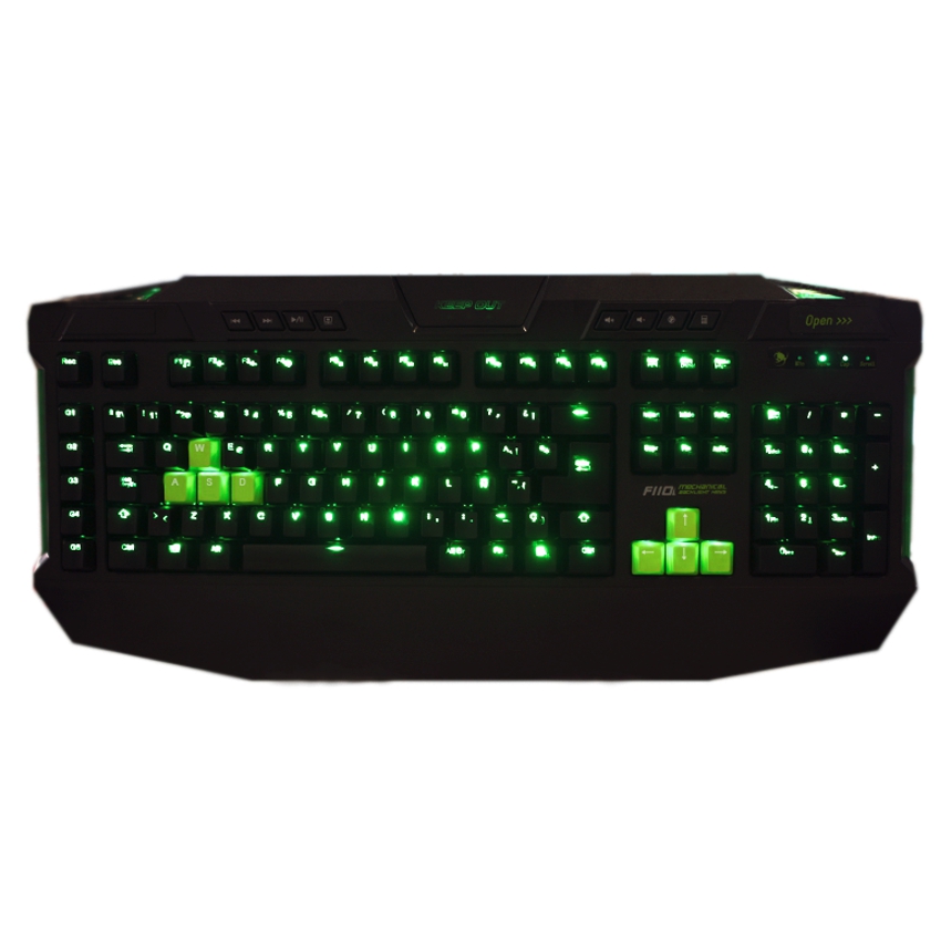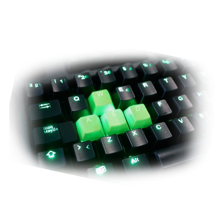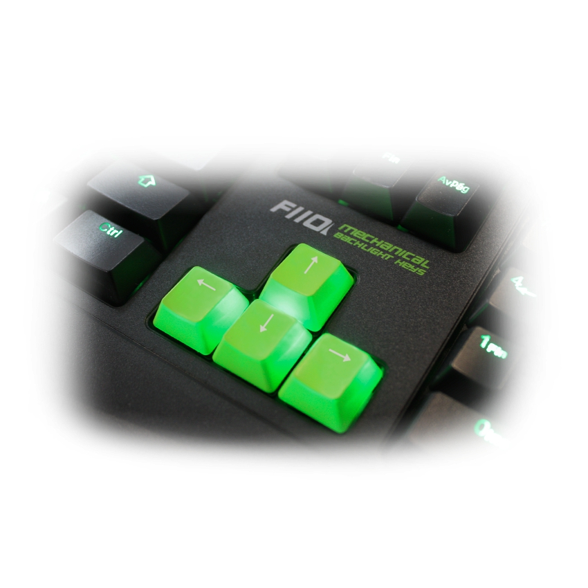 Teclas totalmente mecánicas con tecnología “Non-Click”. WASD y Cursores disponen de teclas tipo “Non-Click” Red y las demás teclas tipo “Non-Click” Black. Teclas retro iluminadas individualmente en verde 110 teclas mecánicas con tecnología “non-click” y vida útil de hasta 50.000.000 pulsaciones.