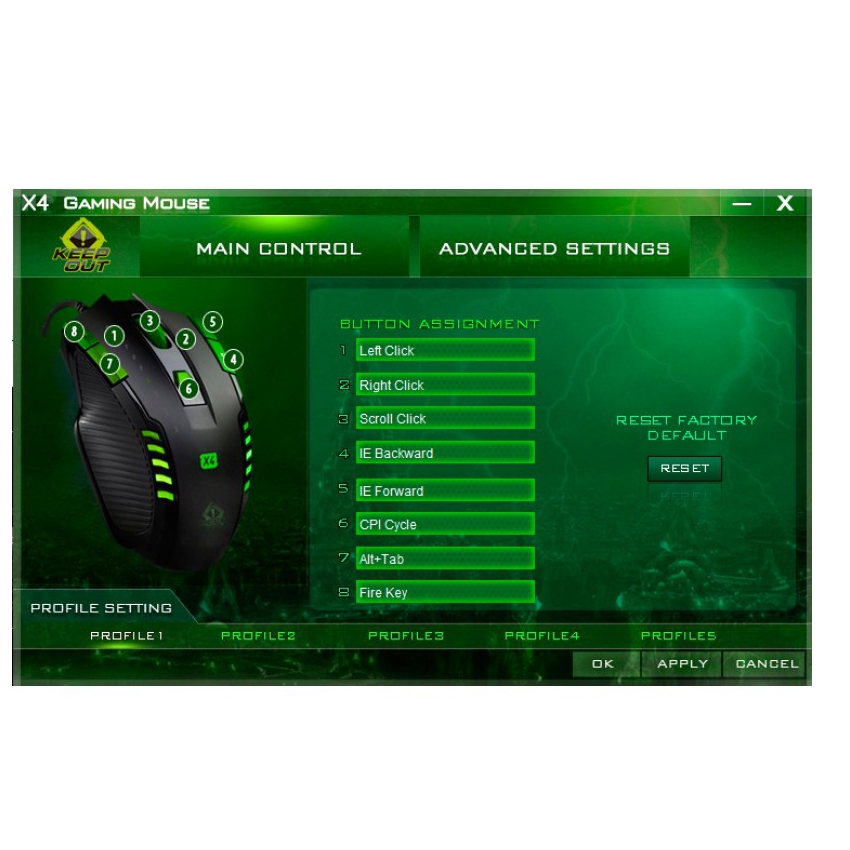 El X4 es un Gaming Mouse que se centra en las necesidades esenciales de los jugadores que requieren gran cantidad de botones programables para ser los mejores en los juegos. Funciona con el nuevo sensor óptico Avago 5050 de extrema calidad, ajustable en 4 niveles de DPI, sus valores están comprendidos entre 600-2500DPI, puede ser fácilmente identificado por sus indicadores de la luz laterales. Con sus 8 botones programables, los usuarios pueden guardar hasta 8 macros diferentes en cada uno de sus cinco perfiles. Esta información se almacena en la memoria interna del X4, que permite a los usuarios utilizar sus ajustes preferidos en diferentes equipos sin volver a instalar el software o reconfiguración. El X4 es ambidiestro y adecuado para todo tipo de los jugadores.