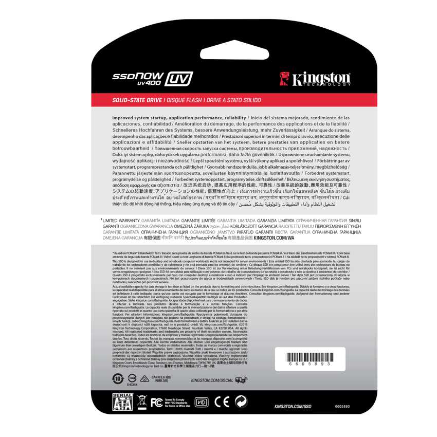 Descripción Insufle nueva vida a su sistema. La unidad SSDNow UV400 de Kingston incorpora un controlador Marvell de 4 canales, que permite alcanzar velocidades increíbles y un rendimiento mucho mayor que un disco duro mecánico. Mejorará drásticamente la capacidad de respuesta de su actual sistema, además de ser 10 veces más rápida que un disco duro de 7200 RPM*.