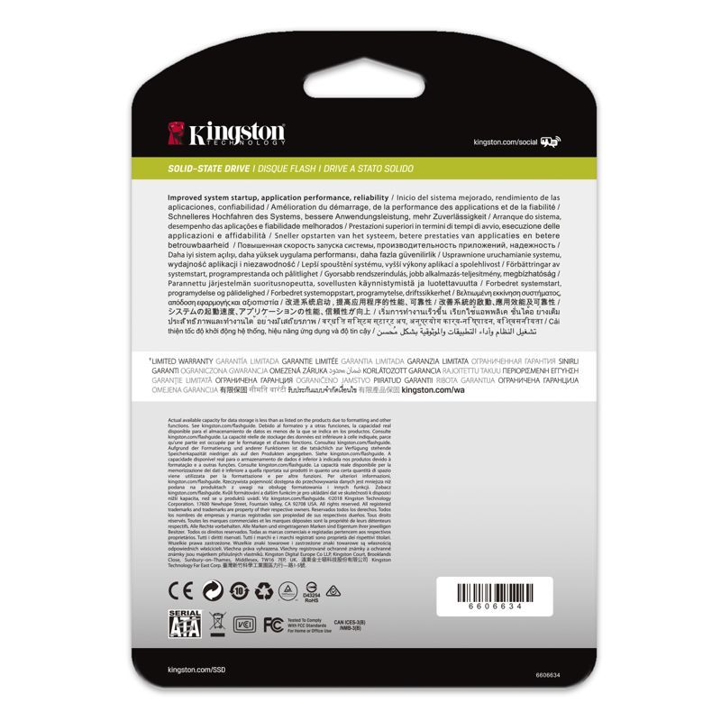 * Carga de trabajo aleatoria de 4KB QD=1 basada en FIO, medida como tiempo necesario para que el 99,9% de los comandos concluyan su recorrido desde el host a la unidad y de vuelta al host. ** Medición realizada una vez que la carga de trabajo ha alcanzado una situación de estabilidad, aunque incluyendo todas las actividades de segundo plano necesarias para un funcionamiento normal y para garantizar la fiabilidad de los datos. *** Sobre la base de una capacidad de 960 GB. **** Algunas de las capacidades enumeradas en un dispositivo de almacenamiento Flash se emplean para formatear y otras funciones, por lo que no están disponibles para el almacenamiento de datos. Por este motivo, la capacidad real de almacenamiento de datos es inferior a la indicada en los productos. Consulte información más detallada en la Guía de Memoria Flash de Kingston, en kingston.com/flashguide. ***** Garantía limitada basada en cinco años o ?Vida remanente? de SSD, que puede encontrarse mediante el Administrador de SSD de Kingston (kingston.com/SSDManager). Un producto nuevo y sin uso indicará un valor de desgaste de cien (100), en tanto que un producto que haya alcanzado de límite de ciclos de borrado indicará un valor de desgaste de uno (1). Consulte información detallada en kingston.com/wa.