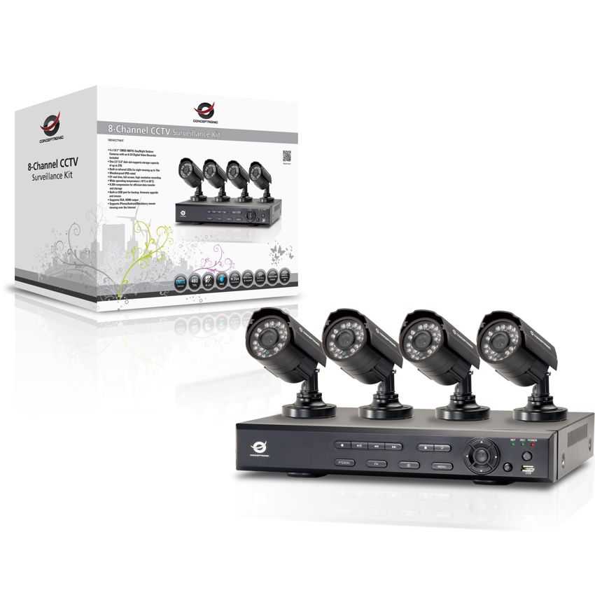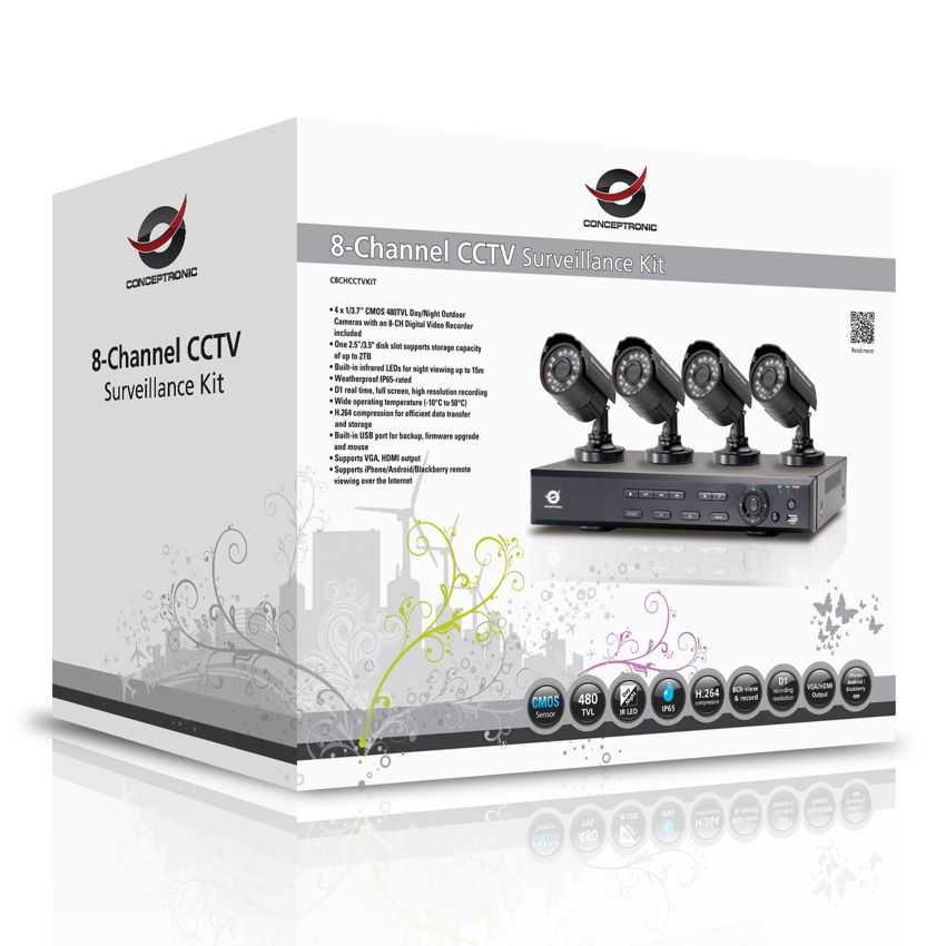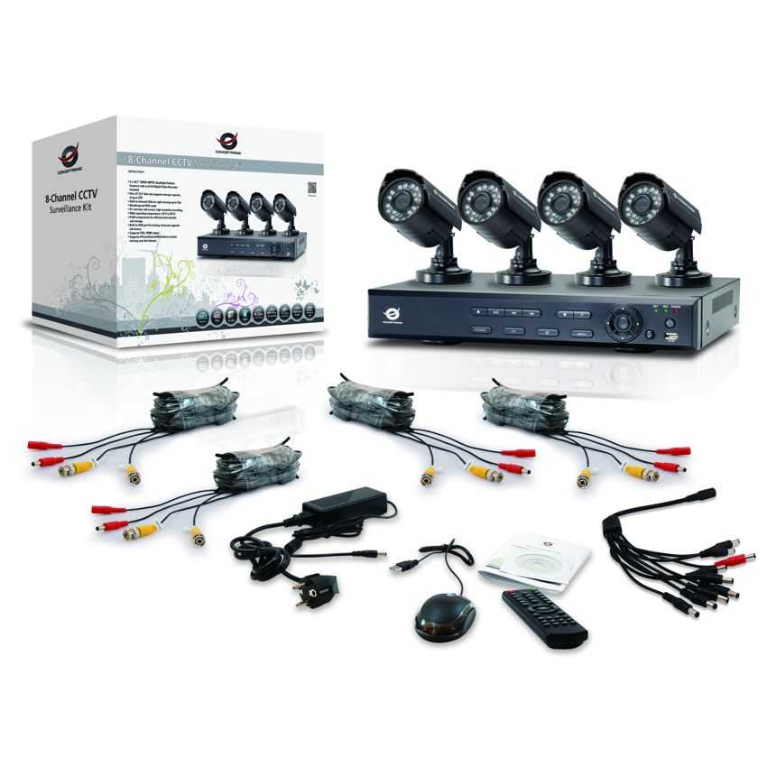 El Kit de vigilancia CCTV de Conceptronic ofrece una forma ideal de supervisar de forma segura un hogar o negocio. Con cuatro cámaras colocadas en diferentes áreas, se cubrirán todos los puntos de acceso de la parte frontal, trasera y los laterales de la propiedad. Los ocho canales se pueden supervisar fácilmente desde cualquier equipo de sobremesa, portátil, tableta o teléfono inteligente utilizando el software gratuito proporcionado. Todas las cámaras cumplen el estándar de impermeabilidad IP65 y funcionan a temperaturas comprendidas entre -10 °C y 50°C. Los LED infrarrojos integrados admiten supervisión nocturna para distancias de hasta 15 metros, lo que proporciona tranquilidad las 24 horas del día. Las cámaras de gran calidad también ofrecen grabación y reproducción en alta resolución a pantalla completa, de forma que la grabación de los datos es sencilla y eficiente con una alta tasa de compresión y hasta 2 TB de capacidad de disco. Todo lo que necesita para conseguir una vigilancia segura de su hogar o negocio. 4 potentes cámaras externas diurnas y nocturnas de 480 líneas de TV CMOS de1/3,7" con una grabadora de vídeo digital de 8 canales incluida Una ranura para discos de 2,5” y 3,5" que admite capacidad de almacenamiento de hasta 2 TB LED infrarrojos integrados para visión nocturna de hasta 15 m Grado de protección de impermeabilidad IP65 Amplio margen de temperatura de funcionamiento (-10 °C a 50 °C) Grabación en alta resolución, a pantalla completa y en tiempo real D1 Compresión H.264 que proporciona un almacenamiento y una transferencia de datos eficientes Puerto USB integrado para copia de seguridad, actualización de firmware y ratón Admite salidas VGA y HDMI Admite visualización remota desde iPhone, Android y Blackberry a través de Internet