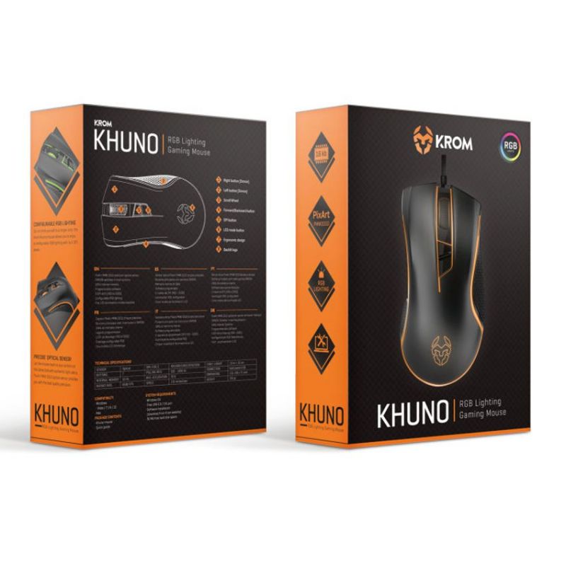 Descripción Khuno es el ratón gaming desarrollado por Krom para quienes necesitan precisión. Con un agarre perfecto, un preciso sensor óptico PixArt PMW 3310 y 5 niveles de DPI configurables, podrás llevar aún más lejos su rendimiento y tu experiencia de uso gracias a su completa iluminación RGB y a las opciones de personalización incluidas en su completo software de configuración. - Sensor óptico PixArt PMW 3310 de gran precisión - Botones principales con switches OMRON - Software programable - 5 niveles de DPI (400 - 5000) - Iluminación RGB configurable