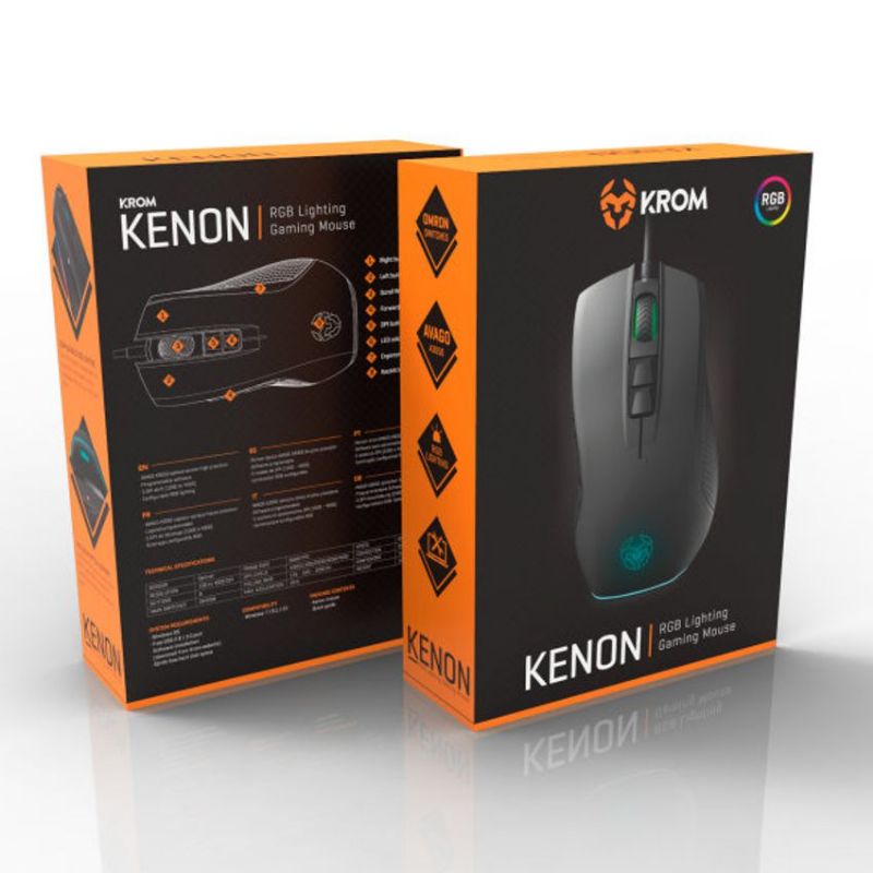 Descripción Kenon es el ratón de Krom que aúna diseño y agarre para hacer de cada batalla una experiencia única. Cuenta con un preciso sensor óptico (AVAGO A3050) y tecnología Omrom para garantizar una mayor durabilidad. Además, podrás configurar su sensibilidad (hasta 5 niveles de DPI: 1000-4000) desde su intuitivo software, el cual también te permite regular los diferentes efectos de iluminación RGB y, por tanto, experimentar una mayor inmersión en el juego.