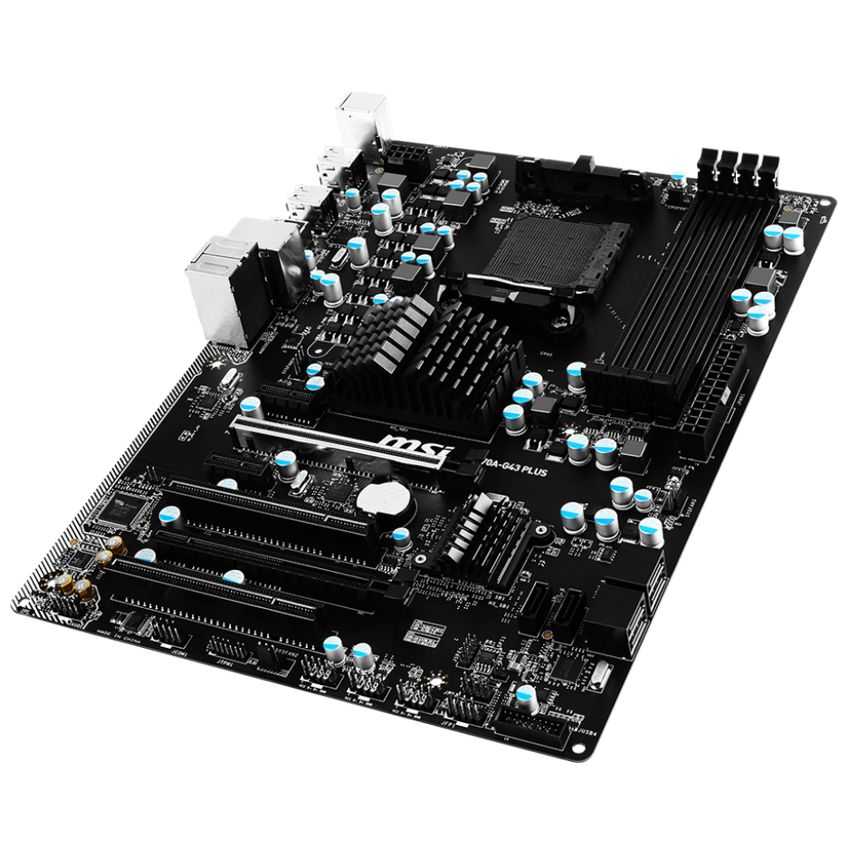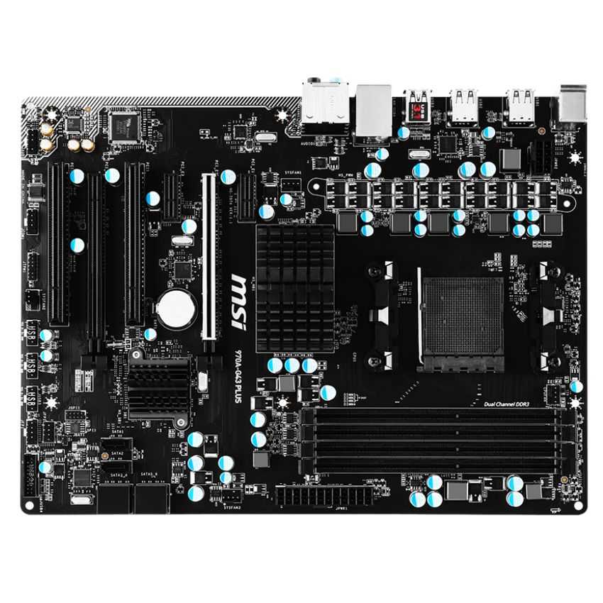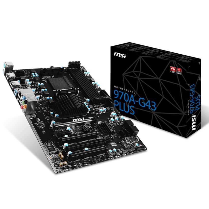 Descripción MSI 970A-G43 PLUS. tipos de memoria compatibles: DDR3-SDRAM, Tipo de ranuras de memoria: DIMM, Canales de memoria: Dual. Familia de procesador: AMD, Procesador compatible: Athlon II, Phenom, Sempron, Socket de procesador: Socket AM3+. Interfaces de unidad de disco duro soportadas: Serial ATA III. Controlador LAN: Realtek RTL8111E, Tipo de interfaz ethernet: Fast Ethernet, Gigabit Ethernet. Componente para: PC, Familia de componentes de tarjeta madre: AMD, Circuito integrado de tarjeta madre: AMD 970