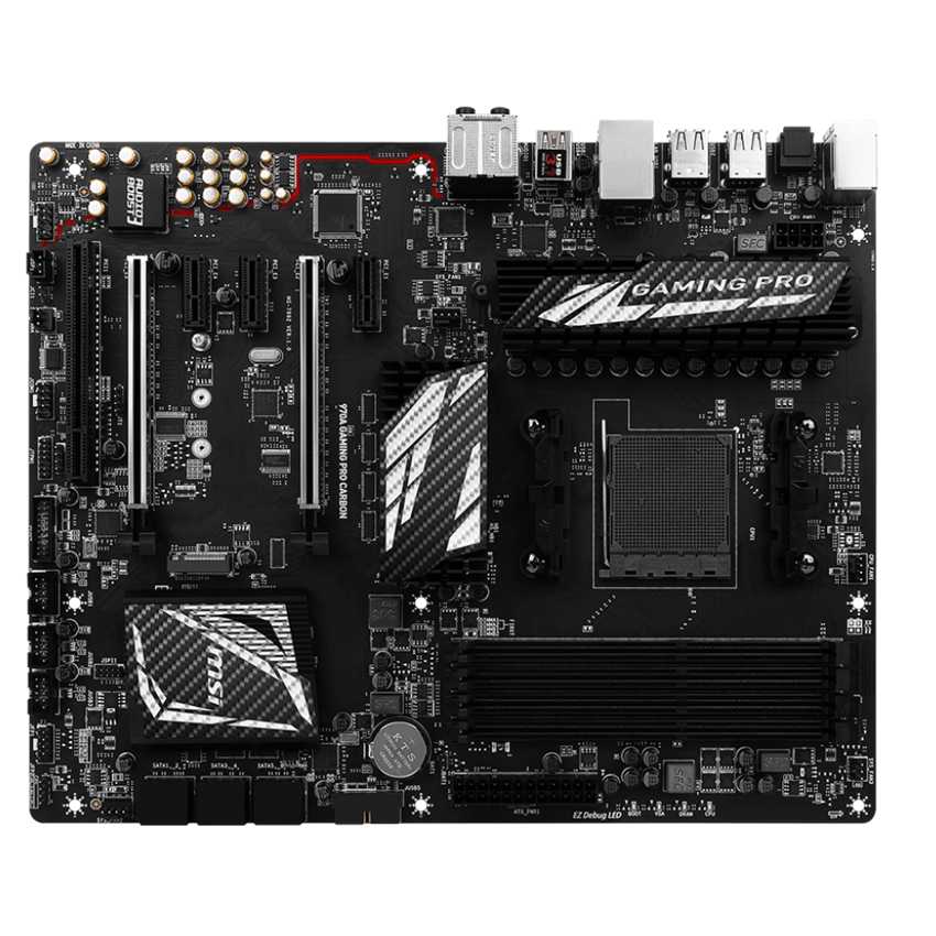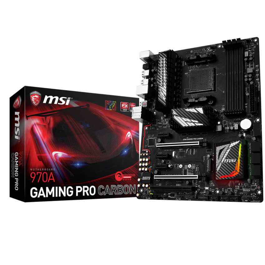 Descripción MSI 970A Gaming Pro Carbon. tipos de memoria compatibles: DDR3-SDRAM, Tipo de ranuras de memoria: DIMM, Velocidades de reloj de memoria soportadas: 1066,1333,1600,1866,2133 MHz. Familia de procesador: AMD, Procesador compatible: AMD FX, Athlon II, Phenom, Sempron, Socket de procesador: Socket AM3+. Interfaces de unidad de disco duro soportadas: Serial ATA III. Controlador LAN: Intel I211-AT. Componente para: PC, Familia de componentes de tarjeta madre: AMD, Circuito integrado de tarjeta madre: AMD 970