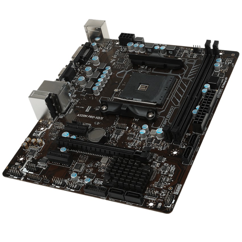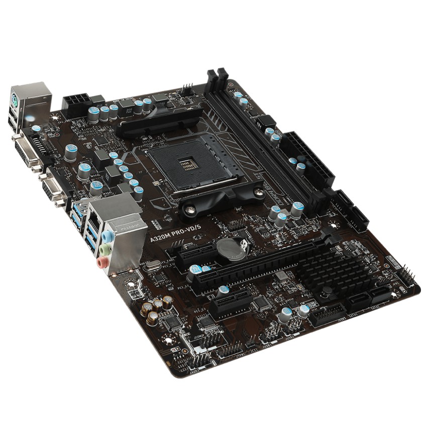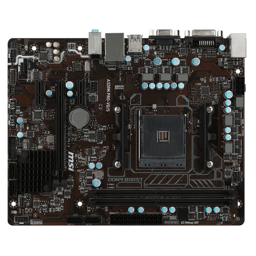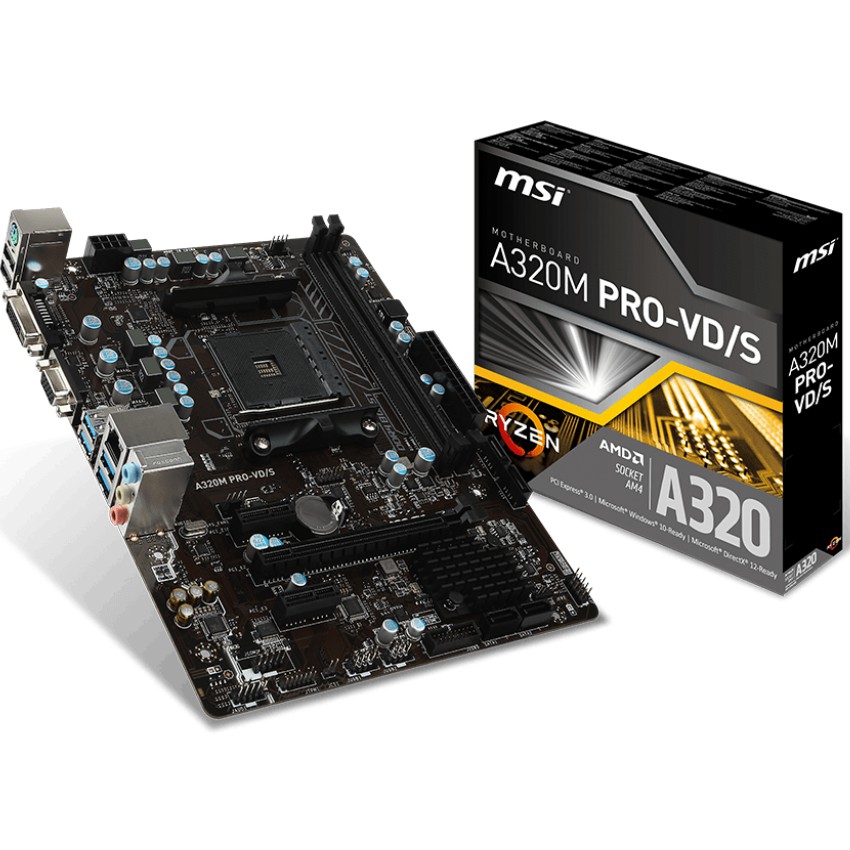Descripción MSI A320M PRO-VD/S. tipos de memoria compatibles: DDR4-SDRAM, Tipo de ranuras de memoria: DIMM, Velocidades de reloj de memoria soportadas: 1866,2133,2400,2667,2933,3200 MHz. Familia de procesador: AMD, Procesador compatible: AMD A,Ryzen, Socket de procesador: Socket AM4. Controlador LAN: Realtek RTL8111H, Tipo de interfaz ethernet: Gigabit Ethernet. Componente para: PC, Familia de componentes de tarjeta madre: AMD, Circuito integrado de tarjeta madre: AMD A320. Memoria máxima de adaptador de gráficos: 2048 MB, Máxima resolución: 2048 x 1280 Pixeles