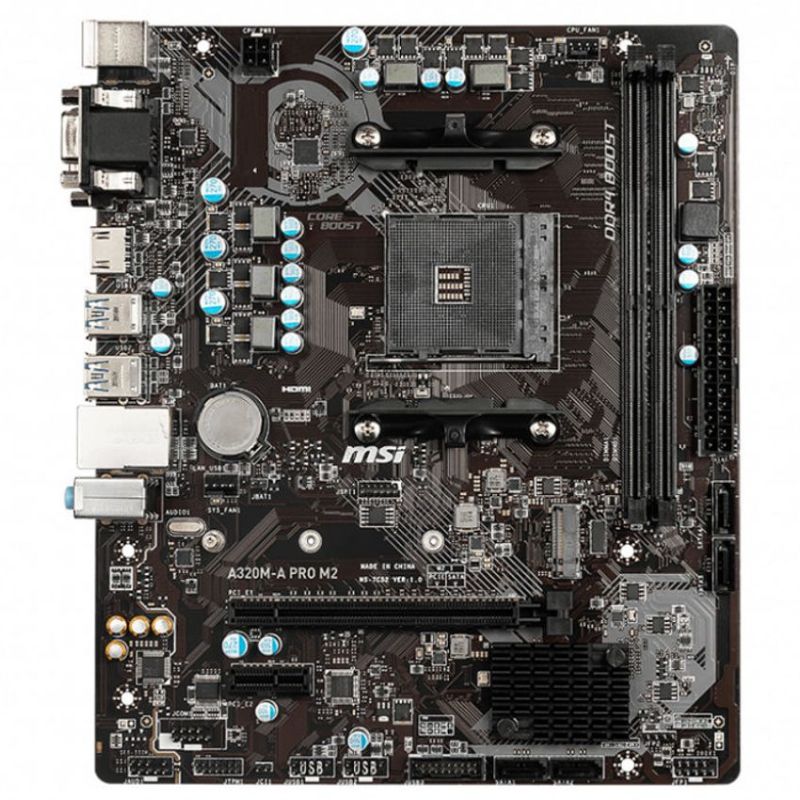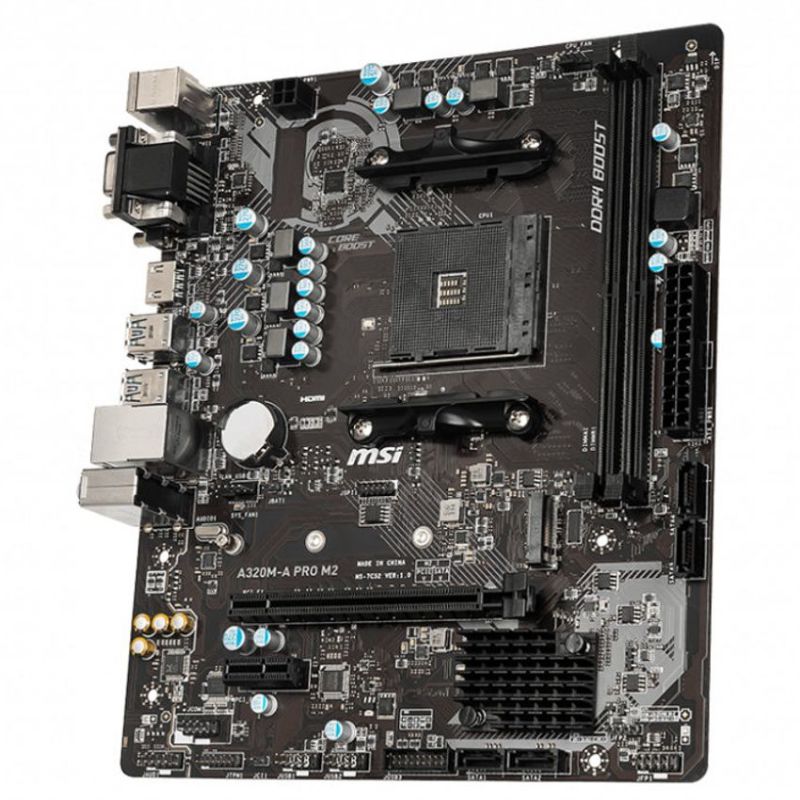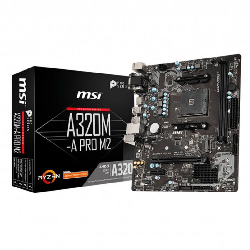 Descripción MSI A320M-A PRO M2. Fabricante de procesador: AMD, Socket de procesador: Zócalo AM4, Procesador compatible: AMD A, AMD Athlon, AMD Athlon X4, AMD Ryzen 3, 2nd Generation AMD Ryzen™ 3, AMD Ryzen 3 3rd Gen,.... tipos de memoria compatibles: DDR4-SDRAM, Tipo de ranuras de memoria: DIMM, Velocidades de reloj de memoria soportadas: 1866,2133,2400,2667,2800,2933,3000,3066,3200 MHz. Interfaces de disco de almacenamiento soportados: M.2, Serial ATA III, Tipos de unidades de almacenamiento admitidas: HDD & SSD. Memoria máxima de adaptador de gráficos: 2048 MB, Máxima resolución: 4096 x 2160 Pixeles. Conector USB: USB tipo A