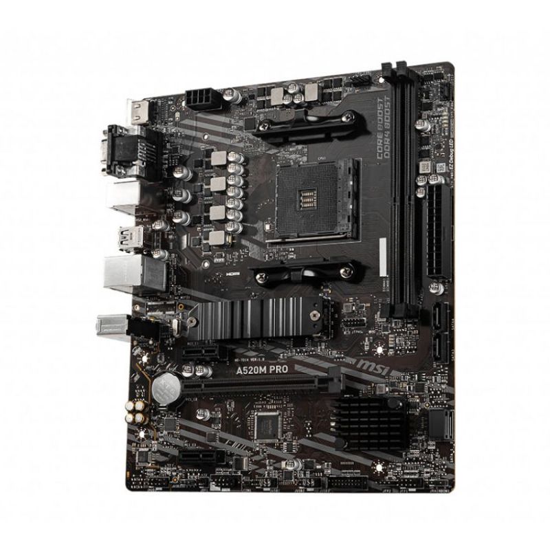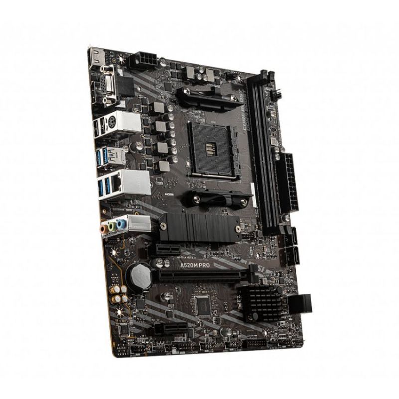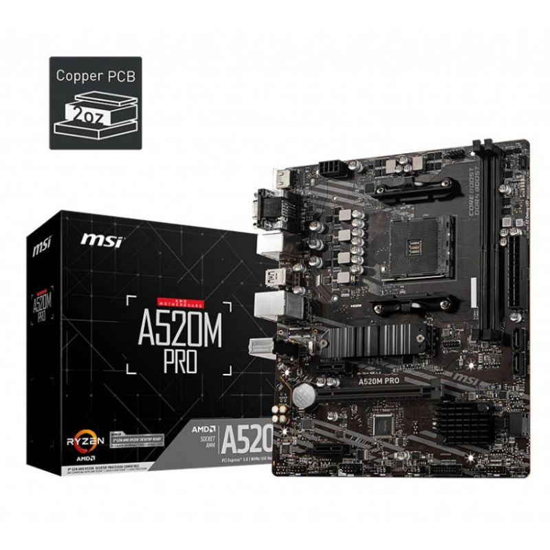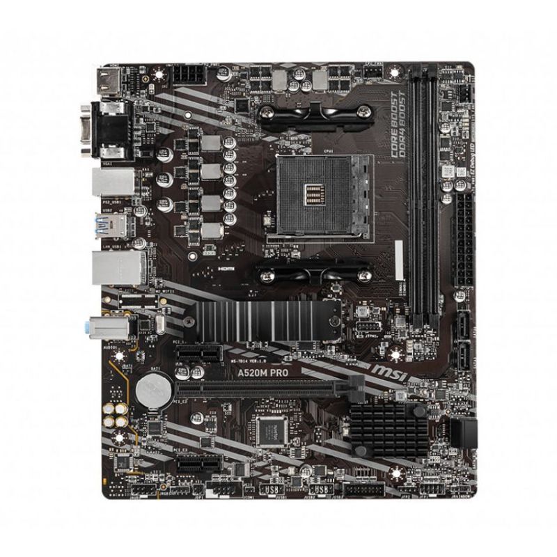 Descripción MSI A520M PRO. Fabricante de procesador: AMD, Socket de procesador: Zócalo AM4, Procesador compatible: AMD Ryzen 3 3rd Gen, 3rd Generation AMD Ryzen 5, 3rd Generation AMD Ryzen 7, 3rd Generation AMD.... tipos de memoria compatibles: DDR4-SDRAM, Tipo de ranuras de memoria: DIMM, Velocidades de reloj de memoria soportadas: 1866,2133,2400,2667,2800,2933,3000,3066,3200,3466,3600,3733,3866,4000,4133,4266,4400,4466 MHz. Interfaces de disco de almacenamiento soportados: PCI Express 3.0, SATA, Tipos de unidades de almacenamiento admitidas: HDD & SSD. Máxima resolución: 4096 x 2160 Pixeles. Tipo de interfaz ethernet: Gigabit Ethernet, Controlador LAN: Realtek 8111H