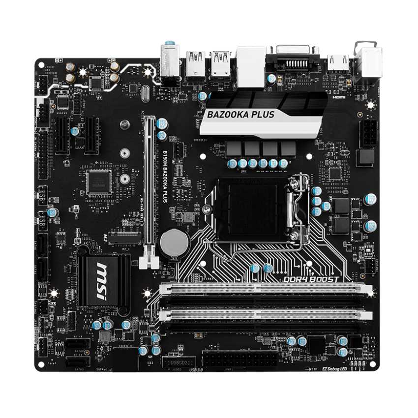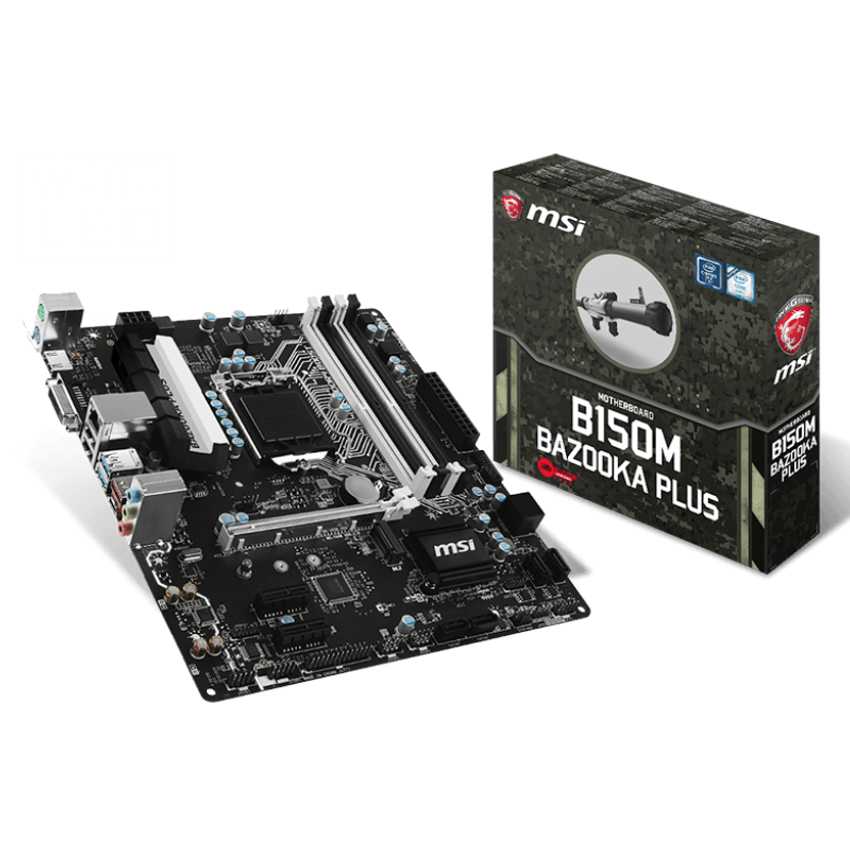 Descripción MSI B150M BAZOOKA PLUS. tipos de memoria compatibles: DDR4-SDRAM, Tipo de ranuras de memoria: DIMM, Canales de memoria: Dual. Familia de procesador: Intel, Procesador compatible: Celeron, Core i3, Core i5, Core i7, Pentium, Socket de procesador: LGA1151. Interfaces de unidad de disco duro soportadas: M.2, Serial ATA III. Controlador LAN: Realtek RTL8111H, Tipo de interfaz ethernet: Gigabit Ethernet. Componente para: PC, Familia de componentes de tarjeta madre: Intel, Circuito integrado de tarjeta madre: Intel B150