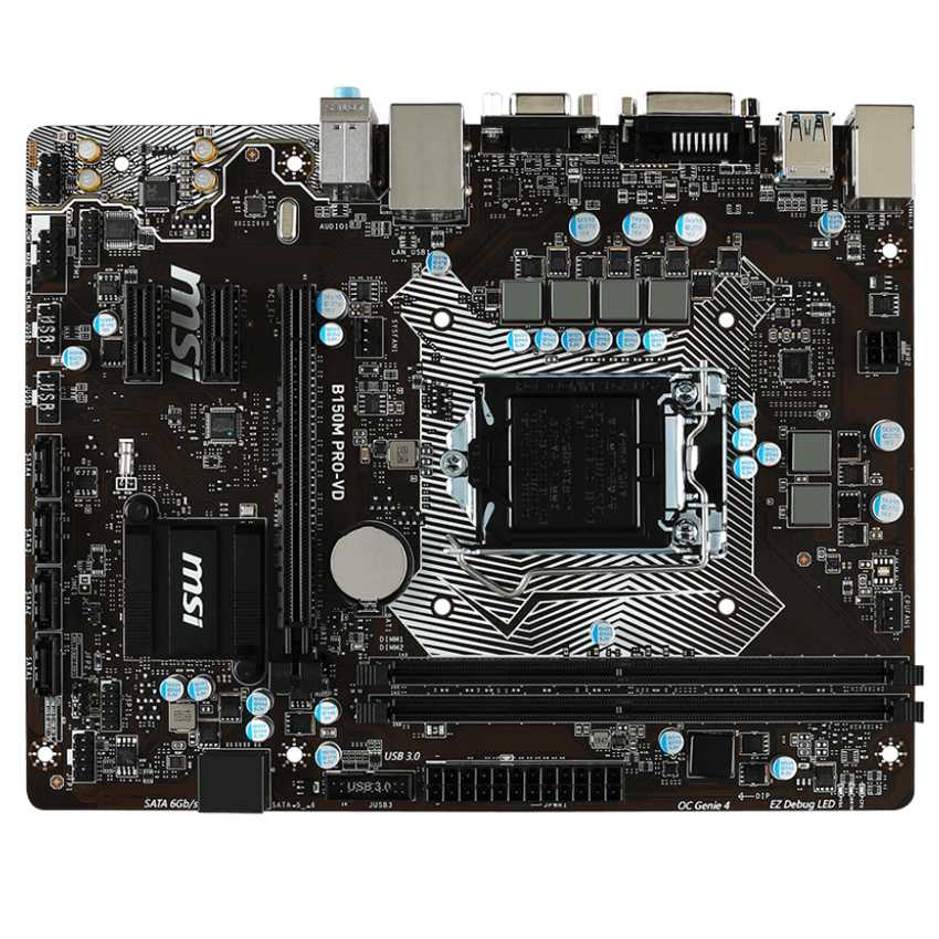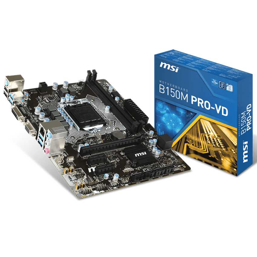 Descripción MSI MB B150M PRO-VD. tipos de memoria compatibles: DDR4-SDRAM, Tipo de ranuras de memoria: DIMM, Canales de memoria: Dual. Familia de procesador: Intel, Procesador compatible: Core i3, Core i5, Core i7, Socket de procesador: LGA1151. Interfaces de unidad de disco duro soportadas: Serial ATA II. Tipo de interfaz ethernet: Gigabit. Componente para: PC, Familia de componentes de tarjeta madre: Intel, Circuito integrado de tarjeta madre: Intel B150