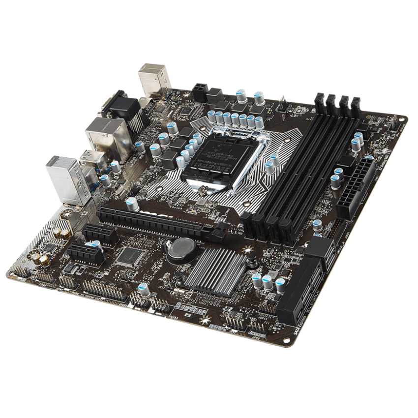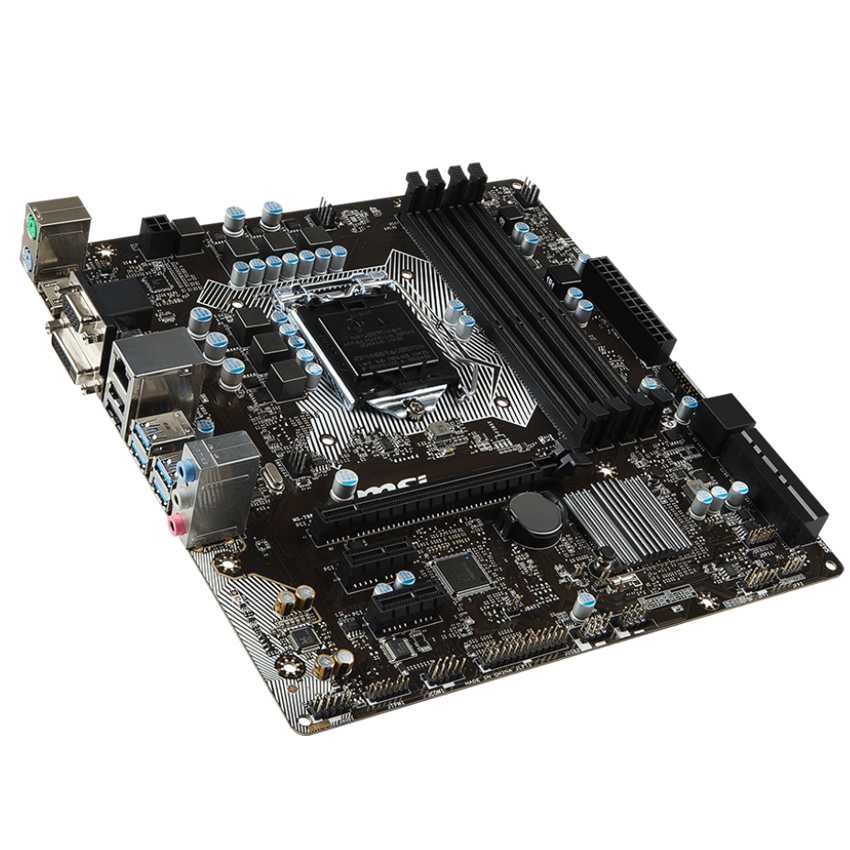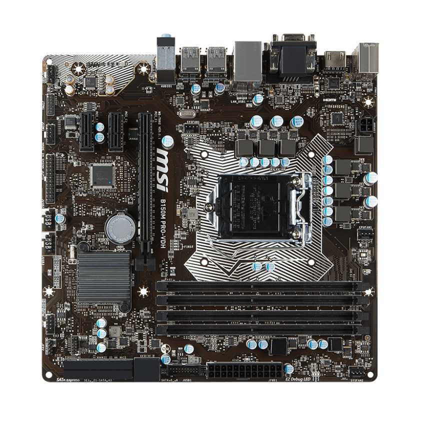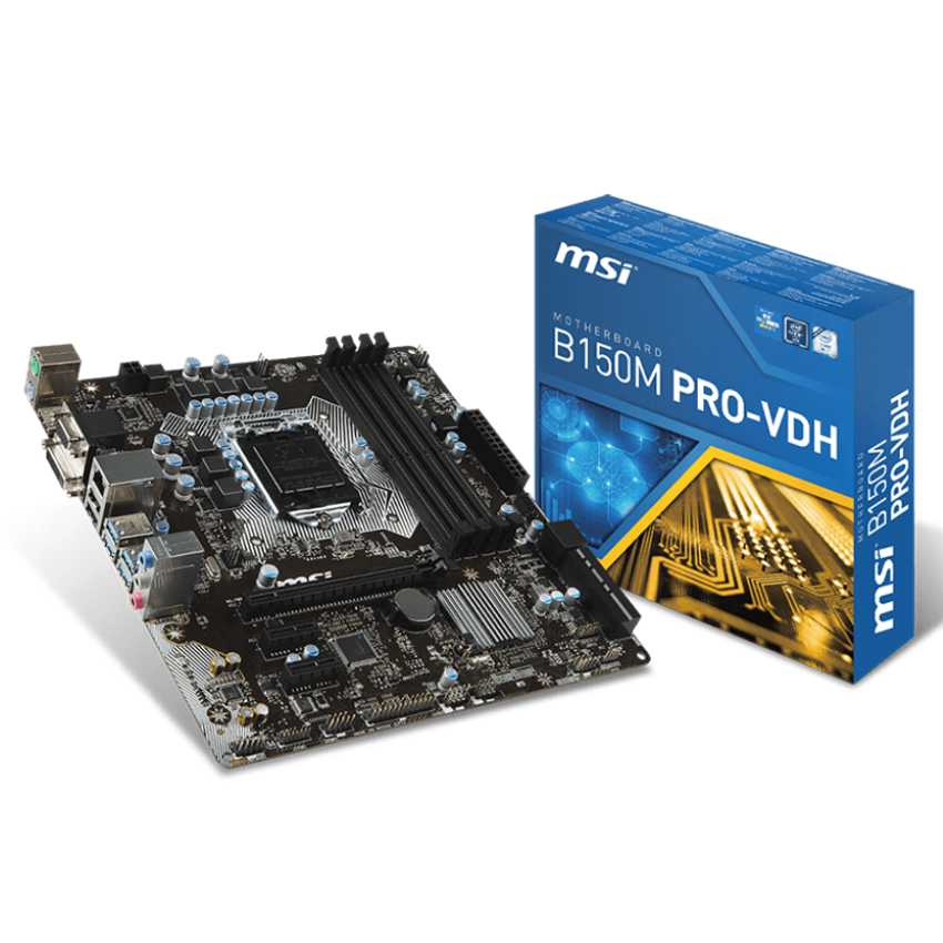 Descripción MSI B150M PRO-VDH. tipos de memoria compatibles: DDR4-SDRAM, Tipo de ranuras de memoria: DIMM, Canales de memoria: Dual. Familia de procesador: Intel, Procesador compatible: Celeron, Pentium, Core i3, Core i5, Core i7, Socket de procesador: LGA1151. Interfaces de unidad de disco duro soportadas: Serial ATA III. Controlador LAN: Realtek RTL8111H, Tipo de interfaz ethernet: Rápido, Gigabit. Componente para: PC, Familia de componentes de tarjeta madre: Intel, Circuito integrado de tarjeta madre: Intel B150