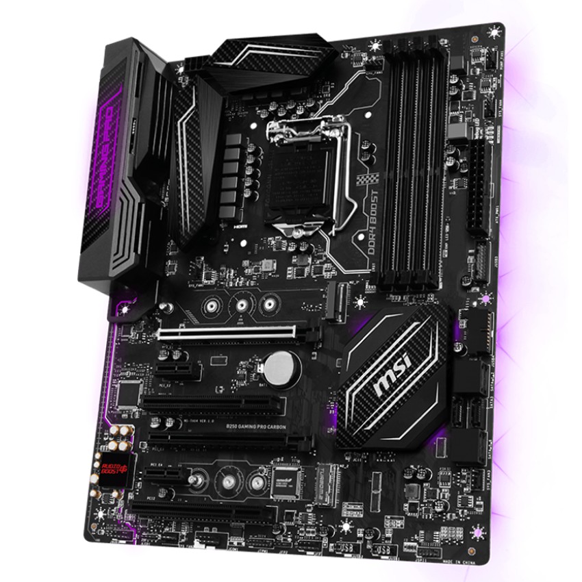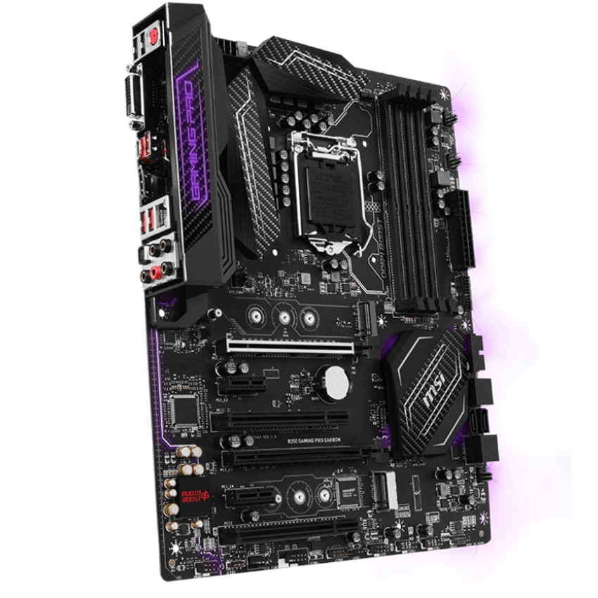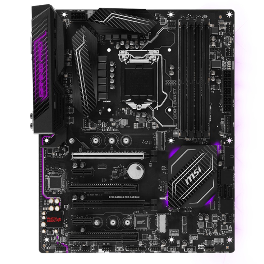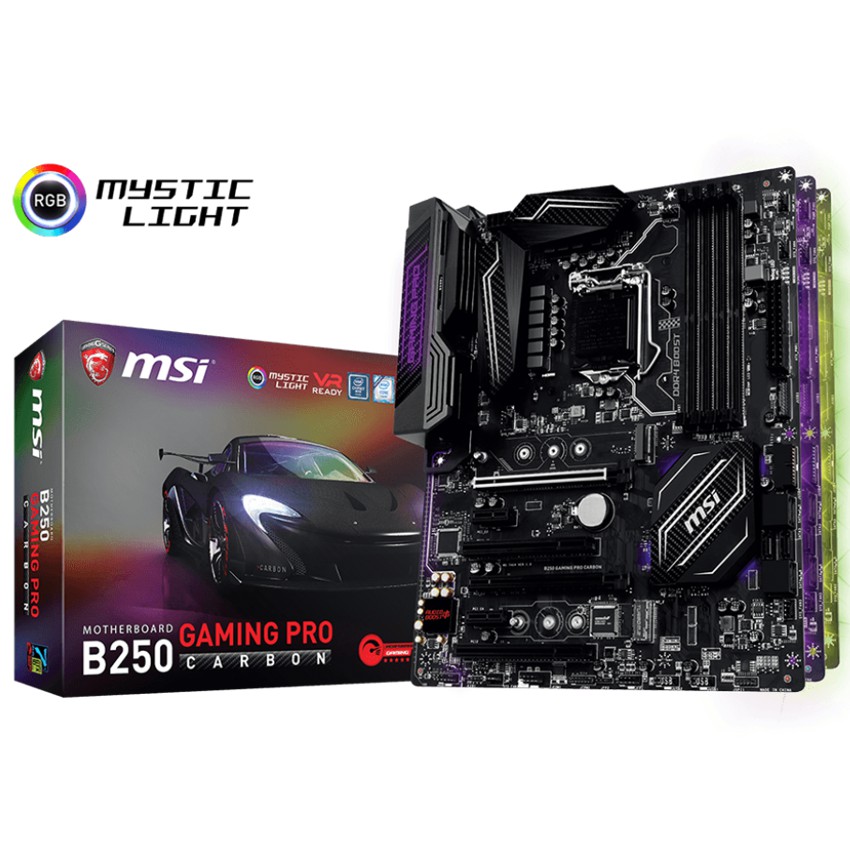 Descripción MSI B250 GAMING PRO CARBON. tipos de memoria compatibles: DDR4-SDRAM, Tipo de ranuras de memoria: DIMM, Velocidades de reloj de memoria soportadas: 2133,2400 MHz. Familia de procesador: Intel, Procesador compatible: Celeron,Core i3,Core i5,Core i7,Pentium, Socket de procesador: LGA 1151 (Socket H4). Interfaces de disco de almacenamiento soportados: SATA, Serial ATA II, Serial ATA III. Controlador LAN: Intel I219-V. Componente para: PC, Familia de componentes de tarjeta madre: Intel, Circuito integrado de tarjeta madre: Intel B250