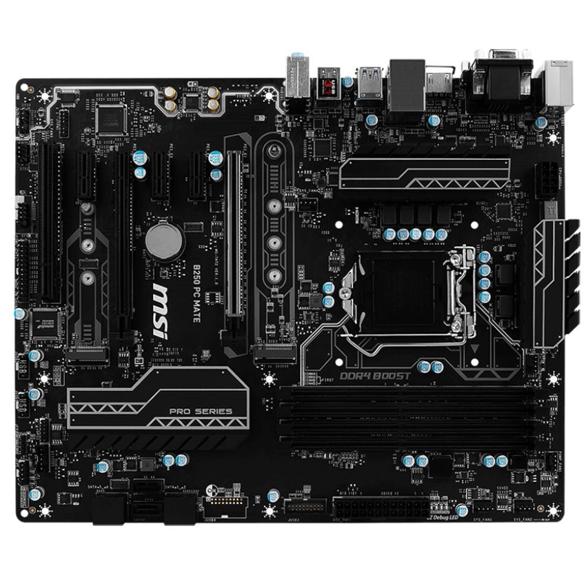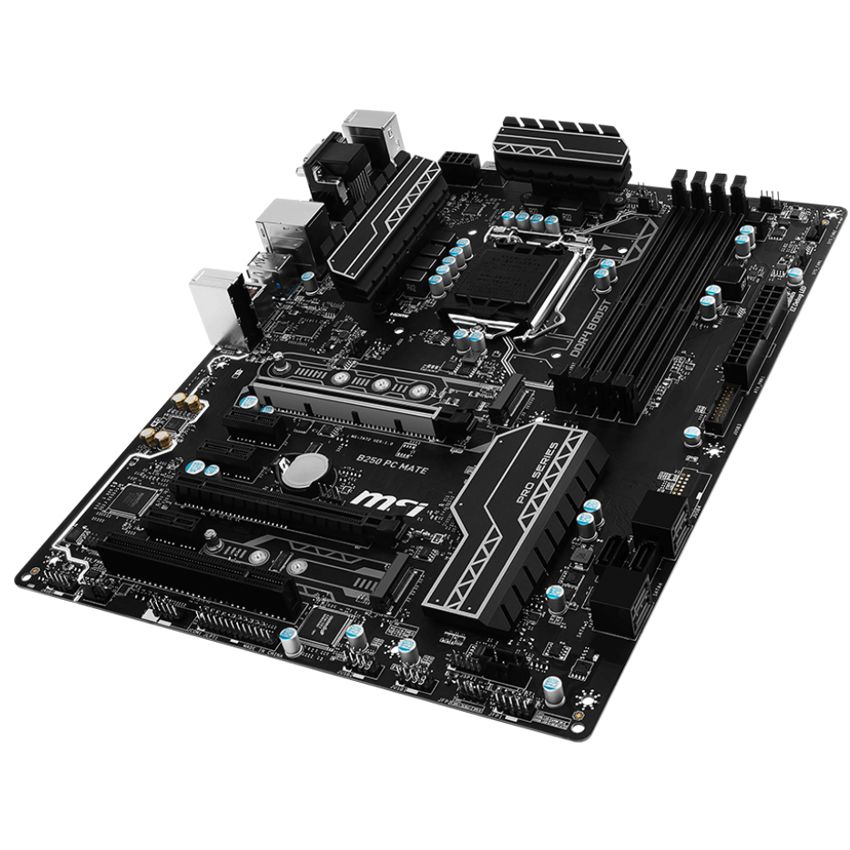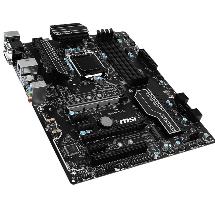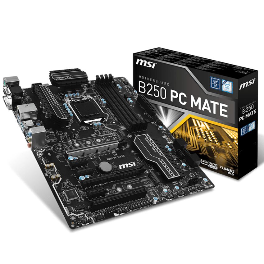 Descripción MSI B250 PC MATE. tipos de memoria compatibles: DDR4-SDRAM, Tipo de ranuras de memoria: DIMM, Canales de memoria: Dual. Familia de procesador: Intel, Procesador compatible: Core i3, Core i5, Core i7, Socket de procesador: LGA1151. Controlador LAN: Intel I219-V. Componente para: PC, Familia de componentes de tarjeta madre: Intel, Circuito integrado de tarjeta madre: Intel B250. Soporte para proceso paralelo: 2-Way CrossFireX
