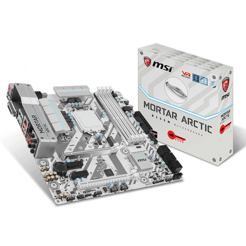 Descripción MSI B250M MORTAR ARCTIC. tipos de memoria compatibles: DDR4-SDRAM, Tipo de ranuras de memoria: DIMM, Velocidades de reloj de memoria soportadas: 2133,2400 MHz. Familia de procesador: Intel, Procesador compatible: Core i3,Core i5,Core i7, Socket de procesador: LGA 1151 (Socket H4). Controlador LAN: Intel I219-V, Tipo de interfaz ethernet: Gigabit Ethernet. Componente para: PC, Familia de componentes de tarjeta madre: Intel, Circuito integrado de tarjeta madre: Intel B250. Tipos de BIOS: UEFI