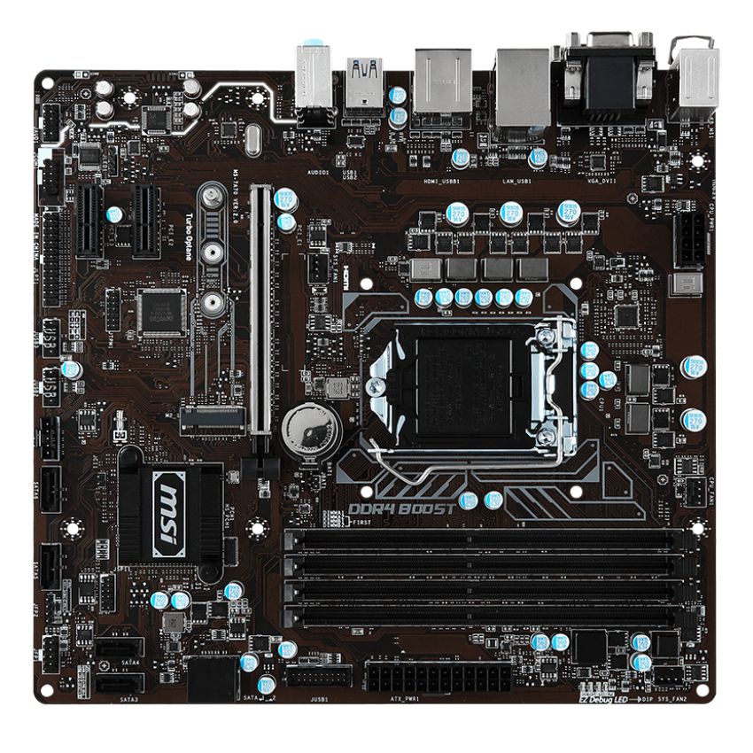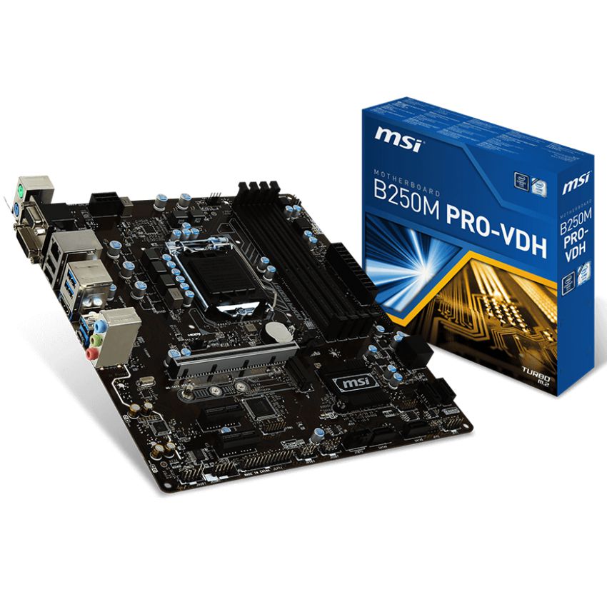 Descripción MSI B250M PRO-VDH. tipos de memoria compatibles: DDR4-SDRAM, Tipo de ranuras de memoria: DIMM, Canales de memoria: Dual. Familia de procesador: Intel, Procesador compatible: Celeron, Core i3, Core i5, Core i7, Pentium, Socket de procesador: LGA1151. Componente para: PC, Familia de componentes de tarjeta madre: Intel, Circuito integrado de tarjeta madre: Intel B250. Tipos de BIOS: UEFI