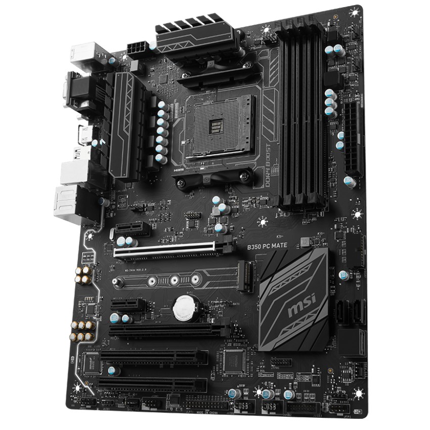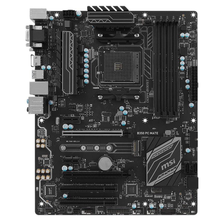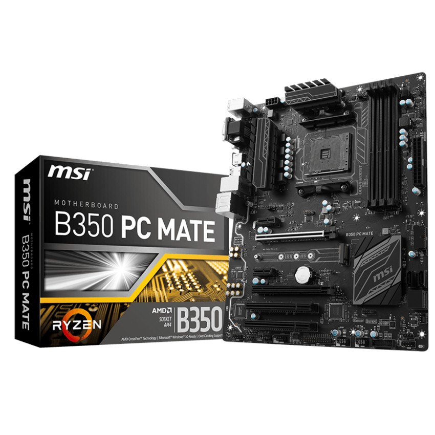 Descripción MSI B350 PC MATE. tipos de memoria compatibles: DDR4-SDRAM, Tipo de ranuras de memoria: DIMM, Velocidades de reloj de memoria soportadas: 1866,2133,2400,2667,2933,3200 MHz. Familia de procesador: AMD, Procesador compatible: AMD A,Athlon,Ryzen, Socket de procesador: Socket AM4. Controlador LAN: Realtek RTL8111H, Tipo de interfaz ethernet: Ethernet rápido, Gigabit Ethernet. Componente para: PC, Familia de componentes de tarjeta madre: AMD, Circuito integrado de tarjeta madre: AMD B350. Soporte para proceso paralelo: 2-Way CrossFireX