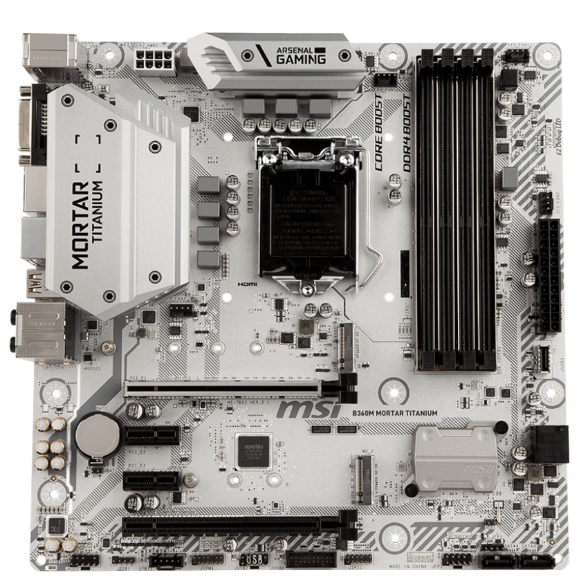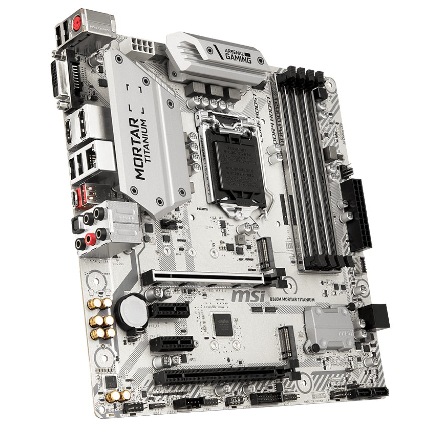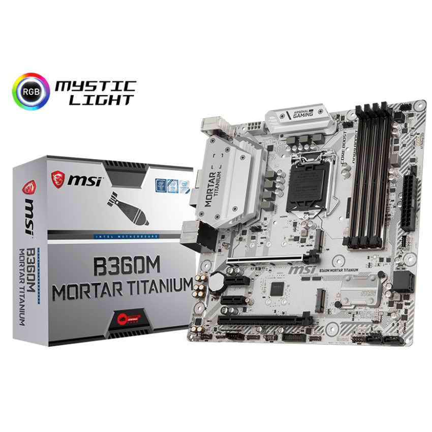 Descripción MSI B360M MORTAR TITANIUM. tipos de memoria compatibles: DDR4-SDRAM, Tipo de ranuras de memoria: DIMM, Velocidades de reloj de memoria soportadas: 2133,2400,2666 MHz. Fabricante de procesador: Intel, Procesador compatible: Intel® Celeron®, Intel Core i3, Intel Core i5, Intel Core i7, Intel® Pentium®, Socket de procesador: LGA 1151 (Socket H4). Interfaces de disco de almacenamiento soportados: M.2, Serial ATA III. Controlador LAN: Intel I219-V, Tipo de interfaz ethernet: Gigabit Ethernet. Componente para: PC, Familia del chipset: Intel, Chipset: Intel B360