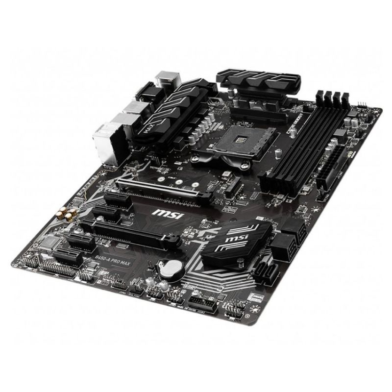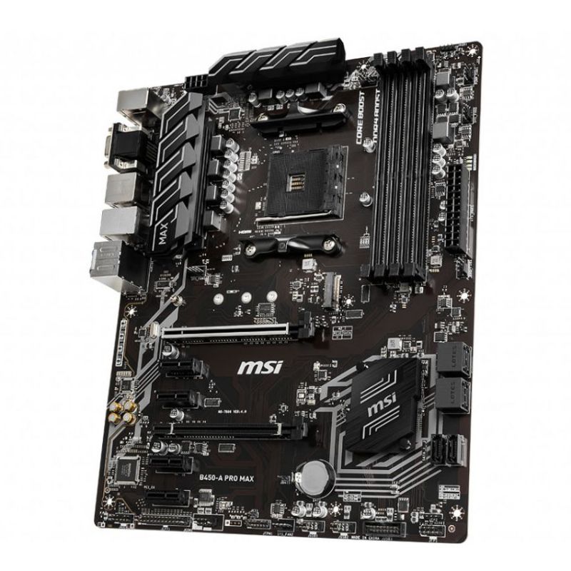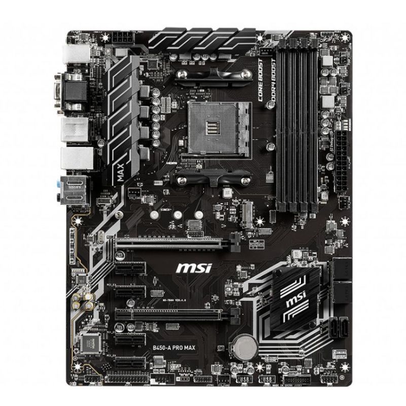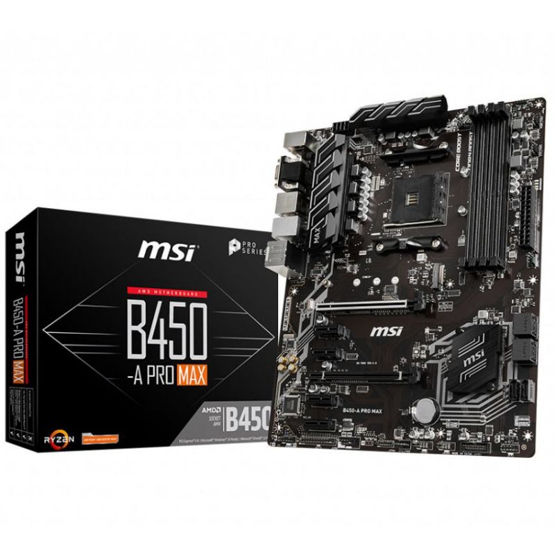 Descripción MSI B450-A PRO MAX. Fabricante de procesador: AMD, Socket de procesador: Zócalo AM4, Procesador compatible: AMD Athlon, AMD Ryzen 3, 2nd Generation AMD Ryzen™ 3, AMD Ryzen 3 3rd Gen, AMD Ryzen 5, 2nd.... tipos de memoria compatibles: DDR4-SDRAM, Tipo de ranuras de memoria: DIMM, Velocidades de reloj de memoria soportadas: 1866,2133,2400,2667,2800,2933,3000,3066,3200,3466,3733,3866,4000,4133 MHz. Interfaces de disco de almacenamiento soportados: PCI Express, PCI Express 2.0, PCI Express 3.0, Serial ATA III, USB 2.0, USB 3.2 Gen 1 (3.1 Gen 1),.... Soporte para proceso paralelo: CrossFireX, Memoria máxima de adaptador de gráficos: 2048 MB. Conector USB: USB tipo A