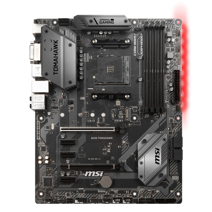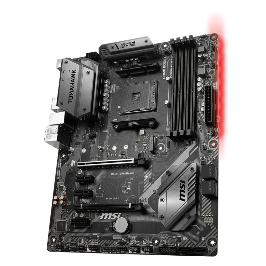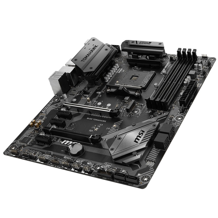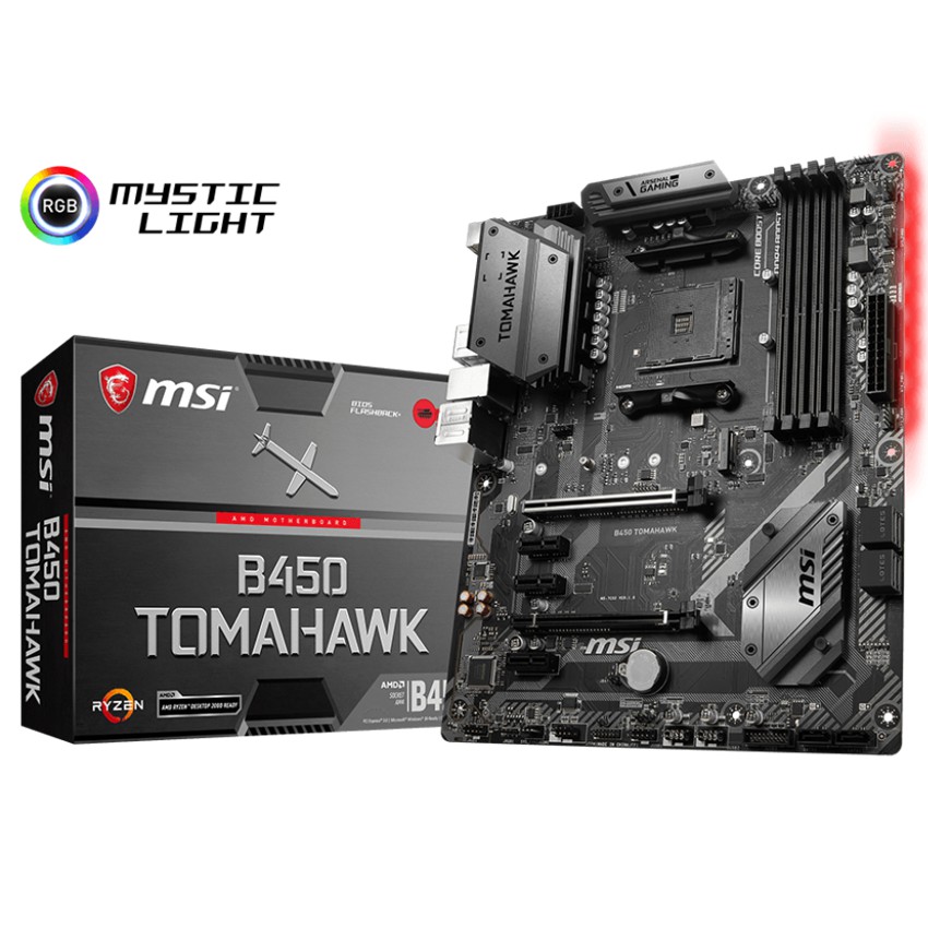 Especificaciones PROCESSOR - Support AMD® Ryzen? 1st and 2nd Generation/ Ryzen? with Radeon? Vega Graphics Processors for Socket AM4 CHIPSET - Intel® B450 Chipset MEMORY - 4 x DDR4 memory slots, support up to 64GB - Supports 1866/ 2133/ 2400/ 2667Mhz (by JEDEC) - Supports 2667/ 2800/ 2933/ 3000/ 3066/ 3200/ 3466 MHz (by A-XMP OC MODE) - Dual channel memory architecture - Supports non-ECC, un-buffered memory - Supports ECC UDIMM memory (non-ECC model) - See supported memory SLOTS - 1 x PCIe 3.0 x16 slot (PCI_E1) - Supports x16 speed with AMD® Ryzen? 1st and 2nd Generation processors - Supports x8 speed with AMD® Ryzen? with Radeon Vega Graphics processors - 1 x PCIe 2.0 x16 slot (PCI_E4, supports x4 mode)1 - 3 x PCIe 2.0 x1 slots1 - PCI_E4 will run x2 speed when installing devices in PCI_E2/ PCI_E3 slot. ONBOARD GRAPHICS - 1 x DVI-D port, support a maximum resolution of 1920x1200@60Hz1 - 1 x HDMI? 1.4 port, supports a maximum resolution of 4096x2160@30Hz, 2560x1600@60Hz1 - Only support when using AMD® Ryzen? with Radeon Vega Graphics ProcessorsMaximum shared memory of 2048 MB MULTI-GPU - Supports 2-Way AMD® CrossFire? Technology STORAGE - AMD® CPU - 2 x SATA 6Gb/s ports1 - 1 x M.2 slot (Key M)1 - Supports PCIe 3.0 x4 and SATA 6Gb/s 2242/ 2260 /2280/ 22110 storage devices - AMD® B450 Chipset - 4 x SATA 6Gb/s ports - SATA5 and SATA6 ports will be unavailable when installing a M.2 device in M.2 slot. RAID - AMD® B450 Chipset - Supports RAID 0, RAID1 and RAID 10 for SATA storage devices USB - AMD® B450 Chipset - 1 x USB 3.1 Gen2 (SuperSpeed USB 10Gbps) Type-C port on the back panel - 1 x USB 3.1 Gen2 (SuperSpeed USB 10Gbps) Type-A port on the back panel - 2 x USB 3.1 Gen1 (SuperSpeed USB) ports available through the internal USB 3.1 Gen1 connector - 6 x USB 2.0 (High-speed USB) ports (2 Type-A ports on the back panel, 4 ports available through the internal USB 2.0 connectors) - AMD® CPU - 2 x USB 3.1 Gen1 (SuperSpeed USB) Type-A ports on the back panel AUDIO - Realtek® ALC892 Codec - 7.1-Channel High Definition Audio LAN - 1 x Realtek® 8111H Gigabit LAN controller INTERNAL CONNECTORS - 1 x 24-pin ATX main power connector - 1 x 8-pin ATX 12V power connector - 6 x SATA 6Gb/s connectors - 2 x USB 2.0 connectors (support additional 4 USB 2.0 ports) - 1 x USB 3.1 Gen1 connectors (support additional 2 USB 3.1 Gen1 ports) - 1 x 4-pin CPU fan connector - 1 x 4-pin water-pump-fan connector - 4 x 4-pin system fan connectors - 1 x TPM module connector - 1 x Front panel audio connector - 2 x System panel connectors - 1 x Chassis Intrusion connector - 1 x Serial Port connector - 1 x Clear CMOS jumper - 2 x 5050 RGB LED strip 12V connectors BACK PANEL PORTS - BIOS FLASHBACK+ Button - PS/2 Combo Port - USB 3.1 Gen1 - LAN Port - HD Audio Connectors - USB 2.0 Port - DVI-D Port - HDMI Port - USB 3.1 Gen2 Type A+C - MSI B450 TOMAHAWK back panel ports DIMENSIONS - 12 in. x 9.6 in. (30.5 cm x 24.4 cm) - ATX Form Factor MOUNTING - 9 mounting holes OPERATING SYSTEM - Support for Windows® 10 64-bit - Support for Windows® 7 64-bit - * To support Windows® 7 64-bit, you must install an AMD Pinnacle Ridge & Summit Ridge CPU.