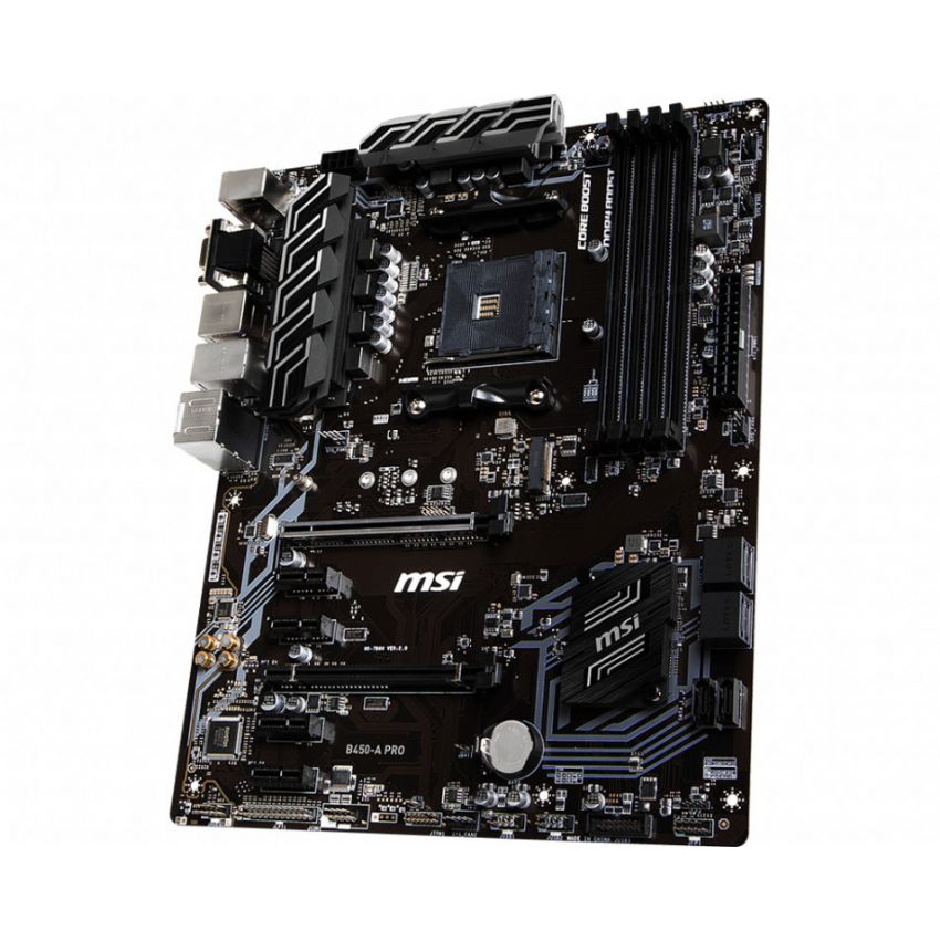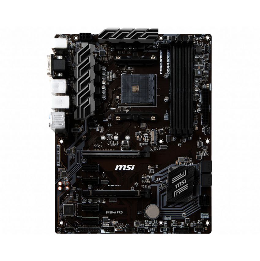 Descripción MSI B450-A-PRO. Fabricante de procesador: AMD, Socket de procesador: Zócalo AM4. tipos de memoria compatibles: DDR4-SDRAM, Tipo de ranuras de memoria: DIMM, Velocidades de reloj de memoria soportadas: 1866,2133,2400,2667,2800,2933,3000,3066,3200,3466 MHz. Interfaces de disco de almacenamiento soportados: PCI Express, Serial ATA III. Conector USB: USB tipo A. Tipo de interfaz ethernet: Gigabit Ethernet