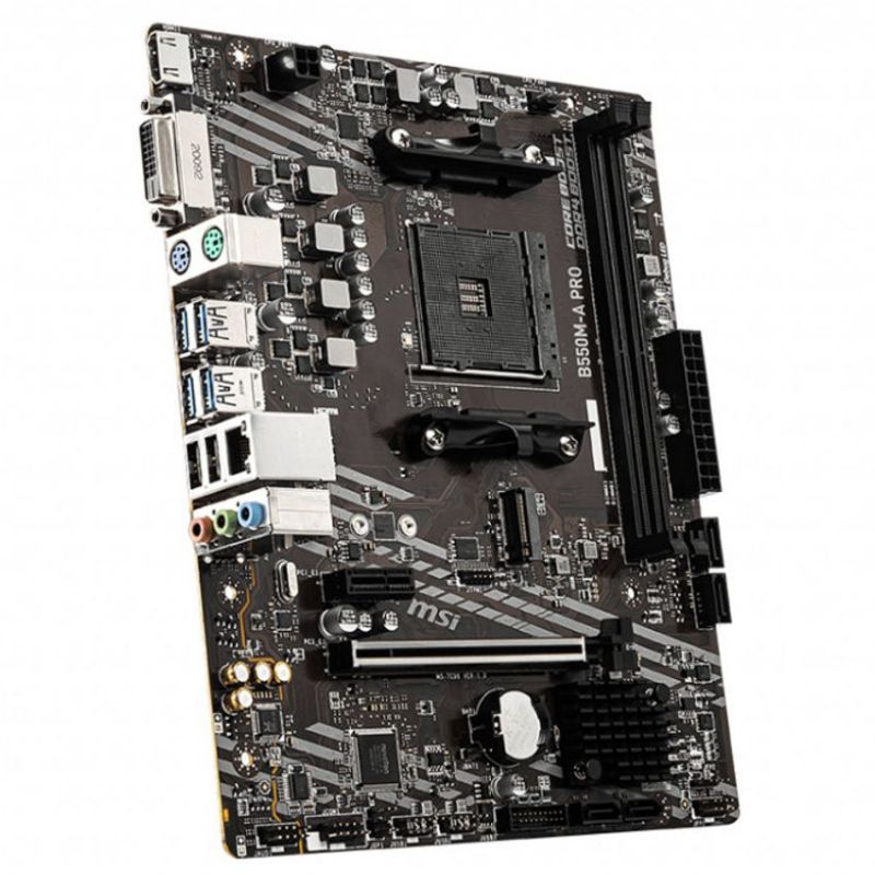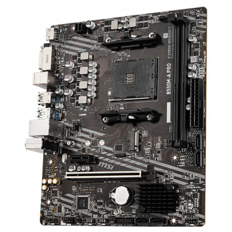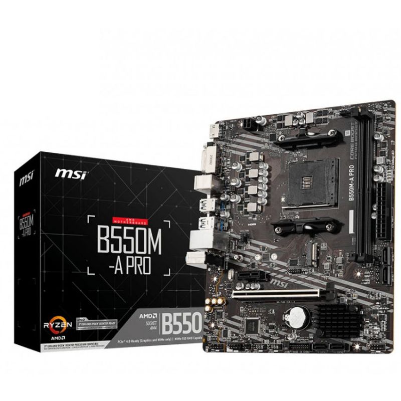 Descripción MSI B550M-A PRO. Socket de procesador: Zócalo AM4, Procesador compatible: AMD Ryzen 3 3rd Gen, 3rd Generation AMD Ryzen 5, Sockets de procesador soportados: Zócalo AM4. tipos de memoria compatibles: DDR4-SDRAM, Tipo de ranuras de memoria: DIMM, Velocidades de reloj de memoria soportadas: 1866,2133,2400,2667,2800,2933,3000,3066,3200,3466,3600,3733,3866,4000,4133,4266,4400,4600 MHz. Interfaces de disco de almacenamiento soportados: M.2, Serial ATA III, Tipos de unidades de almacenamiento admitidas: HDD & SSD. Conector USB: USB tipo A. Tipo de interfaz ethernet: Gigabit Ethernet, Controlador LAN: Realtek RTL8111H