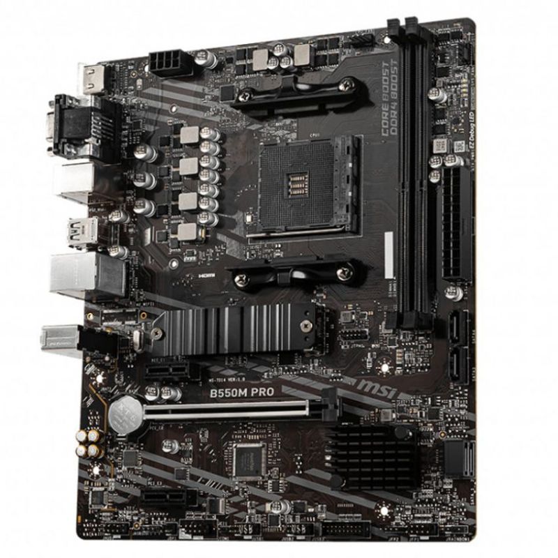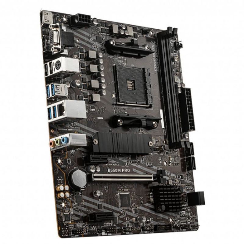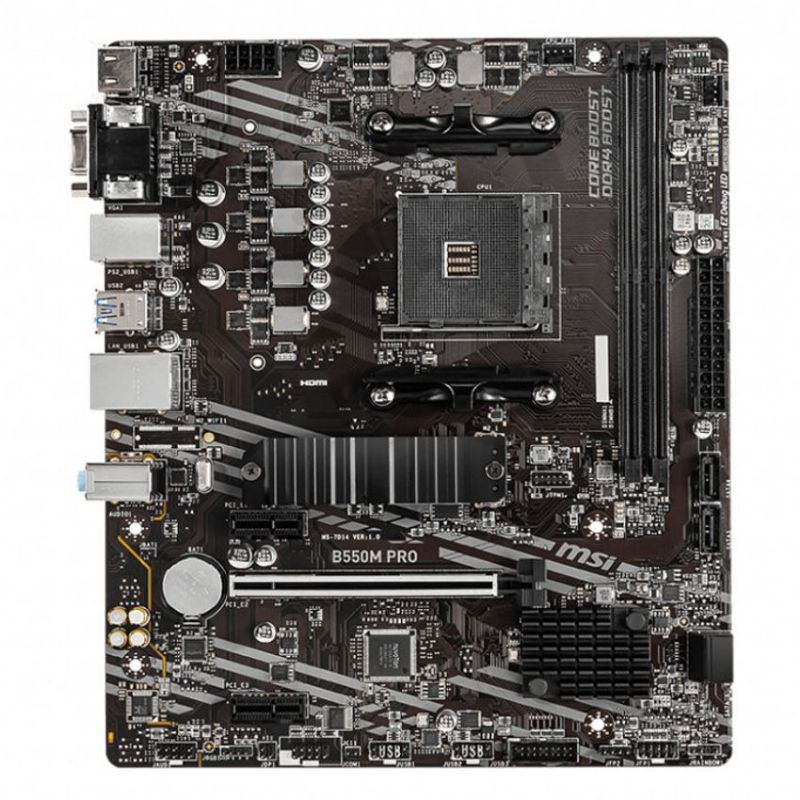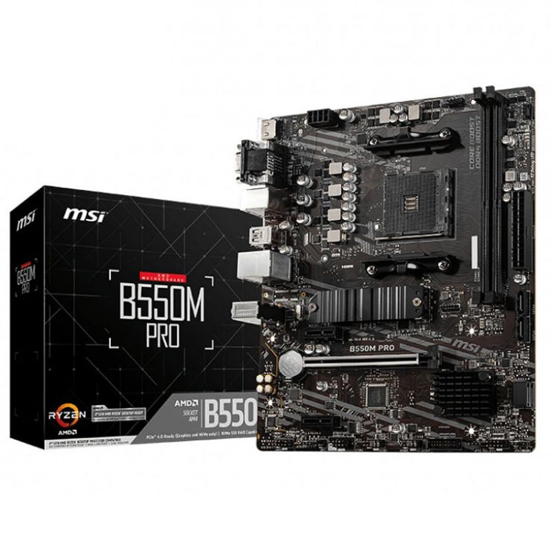 Descripción MSI B550M PRO. Fabricante de procesador: AMD, Socket de procesador: Zócalo AM4, Procesador compatible: AMD Ryzen 3, AMD Ryzen 5, AMD Ryzen 7, 3rd Generation AMD Ryzen 9. tipos de memoria compatibles: DDR4-SDRAM, Tipo de ranuras de memoria: DIMM, Velocidades de reloj de memoria soportadas: 1866,2133,2400,2667,2800,2933,3000,3066,3200,3466,3600,3733,3866,4000,4133,4266,4400,4600 MHz. Interfaces de disco de almacenamiento soportados: Serial ATA III, Tipos de unidades de almacenamiento admitidas: HDD & SSD. Máxima resolución: 4096 x 2160 Pixeles. Tipo de interfaz ethernet: Gigabit Ethernet, Controlador LAN: Realtek RTL8111H