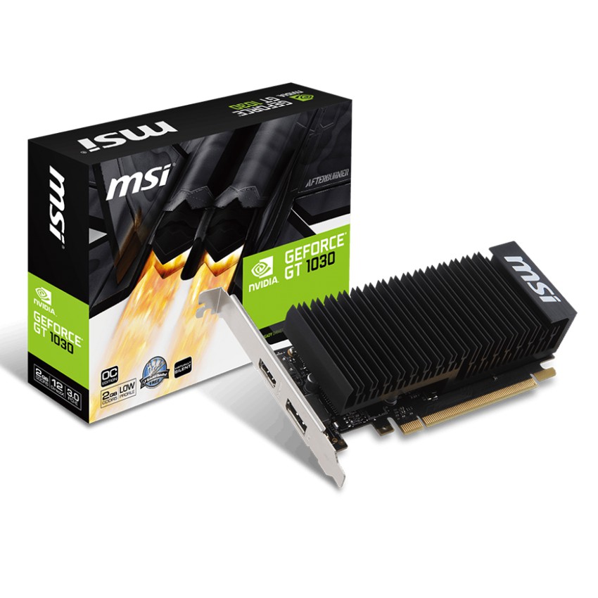 Descripción MSI GeForce GT 1030 2GH OC. Familia de procesadores de gráficos: NVIDIA, Procesador gráfico: GeForce GT 1030, Frecuencia del procesador: 1265 MHz. Gráficos discretos memoria del adaptador: 2 GB, Tipo de memoria de adaptador gráfico: GDDR5, Ancho de datos: 64 bit. Tipo de interfaz: PCI Express x16 3.0, Versión HDMI: 2.0b. Tipo de enfriamiento: Pasivo. Suministro de energía al sistema mínimo: 300 W, Consumo energético: 30 W