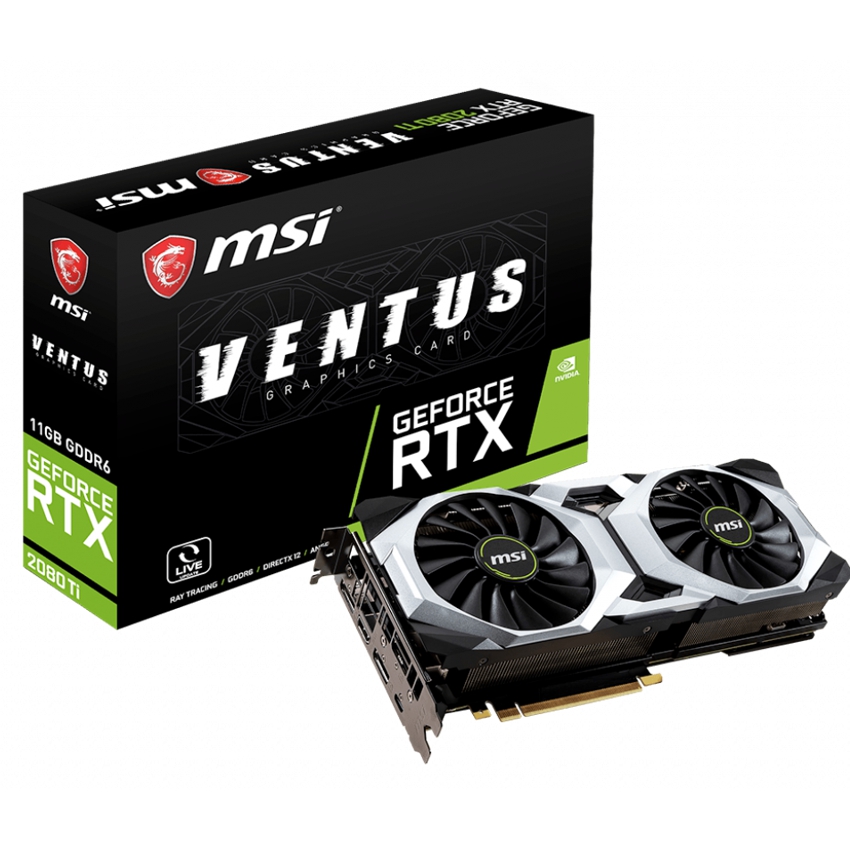 Descripción MSI GeForce RTX 2080 Ti VENTUS 11G. Familia de procesadores de gráficos: NVIDIA, Procesador gráfico: GeForce RTX 2080 Ti, Frecuencia del procesador: 1350 MHz. Capacidad memoria de adaptador gráfico: 11 GB, Tipo de memoria de adaptador gráfico: GDDR6, Ancho de datos: 352 bit. Máxima resolución: 7680 x 4320 Pixeles. Versión DirectX: 12.0, Versión OpenGL: 4.5. Tipo de interfaz: PCI Express x16 3.0. Tipo de enfriamiento: Activo, Número de ventiladores: 2 Ventilador(es)