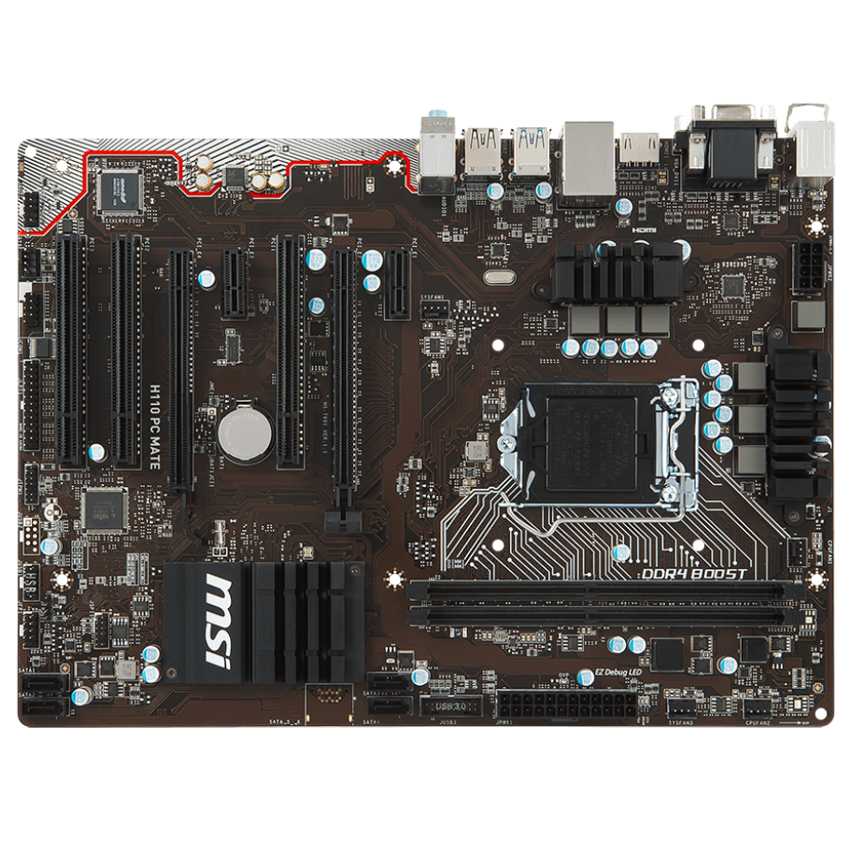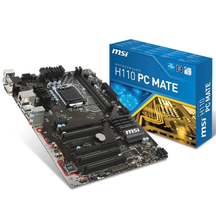 Descripción MSI H110 PC MATE. tipos de memoria compatibles: DDR4-SDRAM, Tipo de ranuras de memoria: DIMM, Canales de memoria: Dual. Familia de procesador: Intel, Procesador compatible: Celeron, Core i3, Core i5, Core i7, Pentium, Socket de procesador: LGA1151. Interfaces de unidad de disco duro soportadas: Serial ATA III. Controlador LAN: Realtek RTL8111H, Tipo de interfaz ethernet: Fast Ethernet, Gigabit Ethernet. Componente para: PC, Familia de componentes de tarjeta madre: Intel, Circuito integrado de tarjeta madre: Intel H110