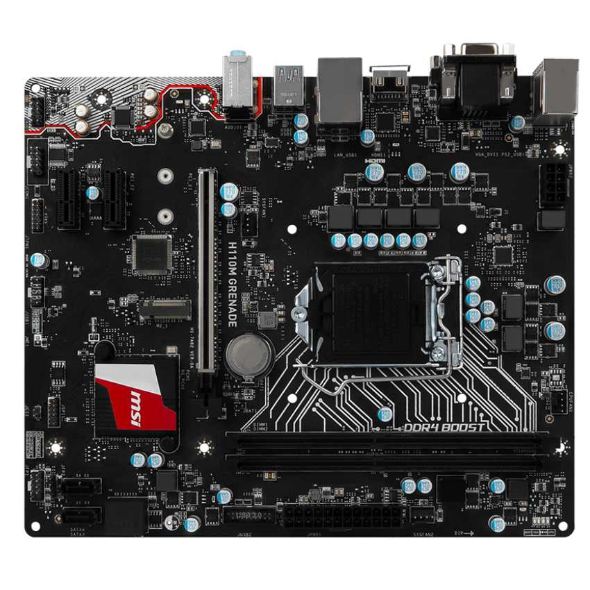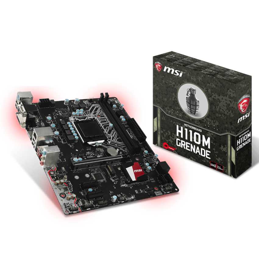 Descripción MSI H110M GRENADE. tipos de memoria compatibles: DDR4-SDRAM, Tipo de ranuras de memoria: DIMM, Canales de memoria: Dual. Familia de procesador: Intel, Procesador compatible: Celeron, Core i3, Core i5, Core i7, Pentium, Socket de procesador: LGA1151. Interfaces de unidad de disco duro soportadas: M.2, Serial ATA III. Controlador LAN: Intel I219-V, Tipo de interfaz ethernet: Gigabit Ethernet. Componente para: PC, Familia de componentes de tarjeta madre: Intel, Circuito integrado de tarjeta madre: Intel H110