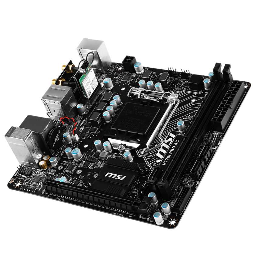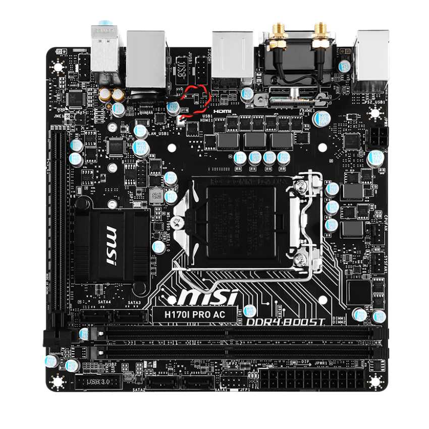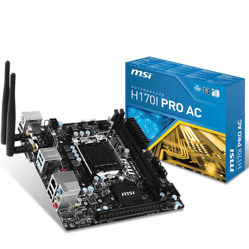 Descripción MSI H170I PRO AC. tipos de memoria compatibles: DDR4-SDRAM, Tipo de ranuras de memoria: DIMM, Canales de memoria: Dual. Familia de procesador: Intel, Procesador compatible: Celeron, Core i3, Core i5, Core i7, Pentium, Socket de procesador: LGA1151. Interfaces de unidad de disco duro soportadas: M.2, Serial ATA III. Tipo de interfaz ethernet: Gigabit, Wi-Fi estándares: IEEE 802.11a, IEEE 802.11ac, IEEE 802.11b, IEEE 802.11g, IEEE 802.11n, Versión de Bluetooth: 4.2. Componente para: PC, Familia de componentes de tarjeta madre: Intel, Circuito integrado de tarjeta madre: Intel H170