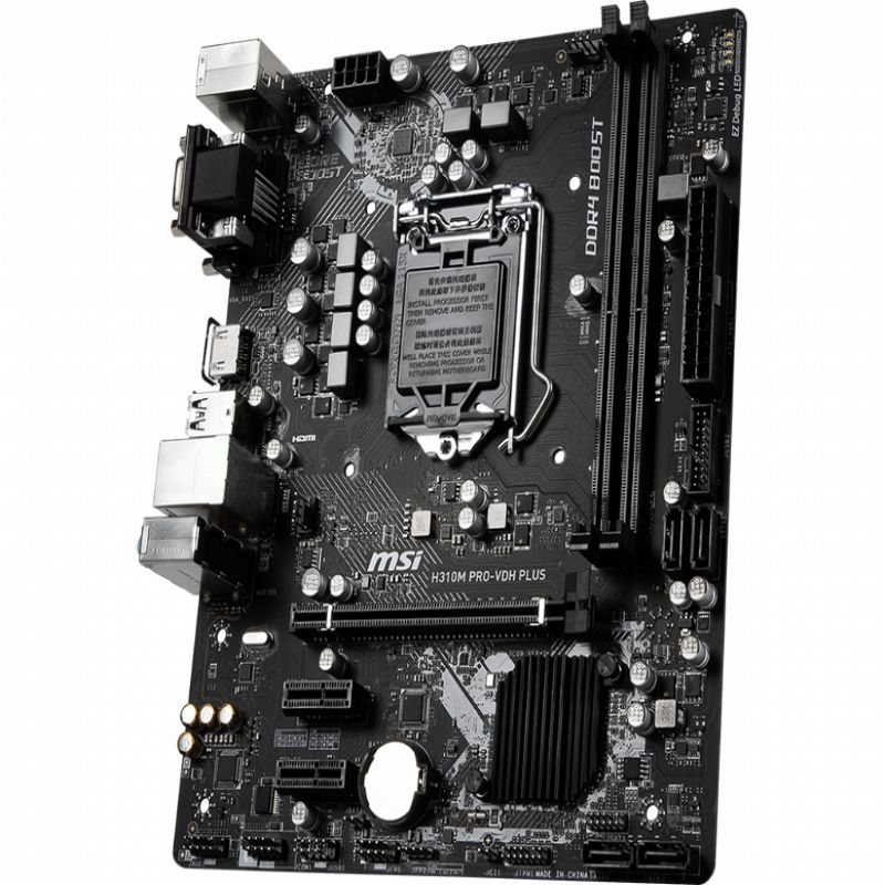 Descripción MSI H310M PRO-VDH PLUS. tipos de memoria compatibles: DDR4-SDRAM, Tipo de ranuras de memoria: DIMM, Velocidades de reloj de memoria soportadas: 2133,2400,2666 MHz. Fabricante de procesador: Intel, Procesador compatible: Intel® Celeron®, Intel® Core? i3, Intel Core i5, Intel Core i7, Intel® Pentium®, Socket de procesador: LGA 1151 (Socket H4). Tipos de unidades de almacenamiento admitidas: HDD,SSD, Tamaño de disco duro: 2.5/3.5". Tipo de interfaz ethernet: Gigabit Ethernet, Controlador LAN: Realtek RTL8111H. Componente para: PC, Familia del chipset: Intel, Chipset: Intel® H310