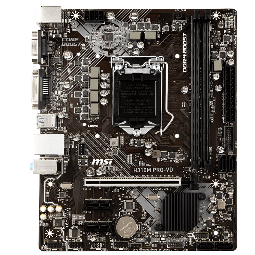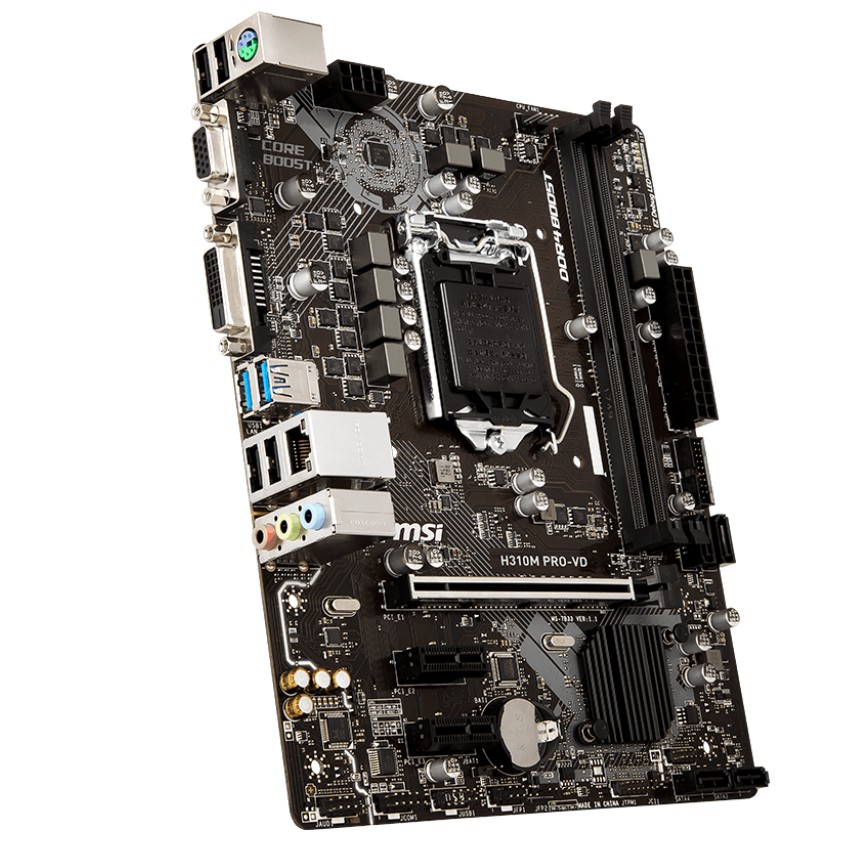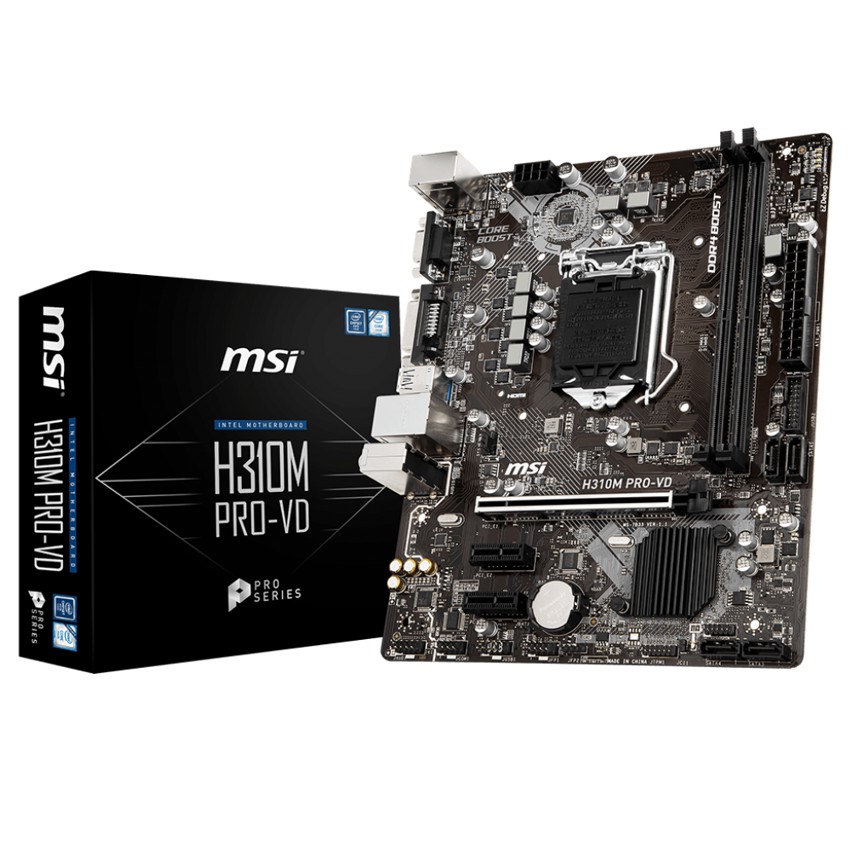 Especificaciones SOCKET: 1151 CPU (MAX SUPPORT): i7 CHIPSET: Intel® H310 Chipset DDR4 MEMORY: 2666/ 2400/ 2133 MHz MEMORY CHANNEL: Dual DIMM SLOTS: 2 MAX MEMORY (GB): 32 PCI-EX16: 1 PCI-E GEN: Gen3 PCI-EX1: 2 SATAIII: 4 TPM (HEADER): 1 LAN: 10/100/1000*1 USB 3.1 PORTS (FRONT): 2(Gen1, Type A) USB 3.1 PORTS (REAR): 2(Gen1, Type A) USB 2.0 PORTS (FRONT): 2 USB 2.0 PORTS (REAR): 4 SERIAL PORTS(FRONT): 1 AUDIO PORTS (REAR): Realtek® ALC887 Codec DVI-D: 1 VGA: 1 DIRECTX: 12 FORM FACTOR: m-ATX