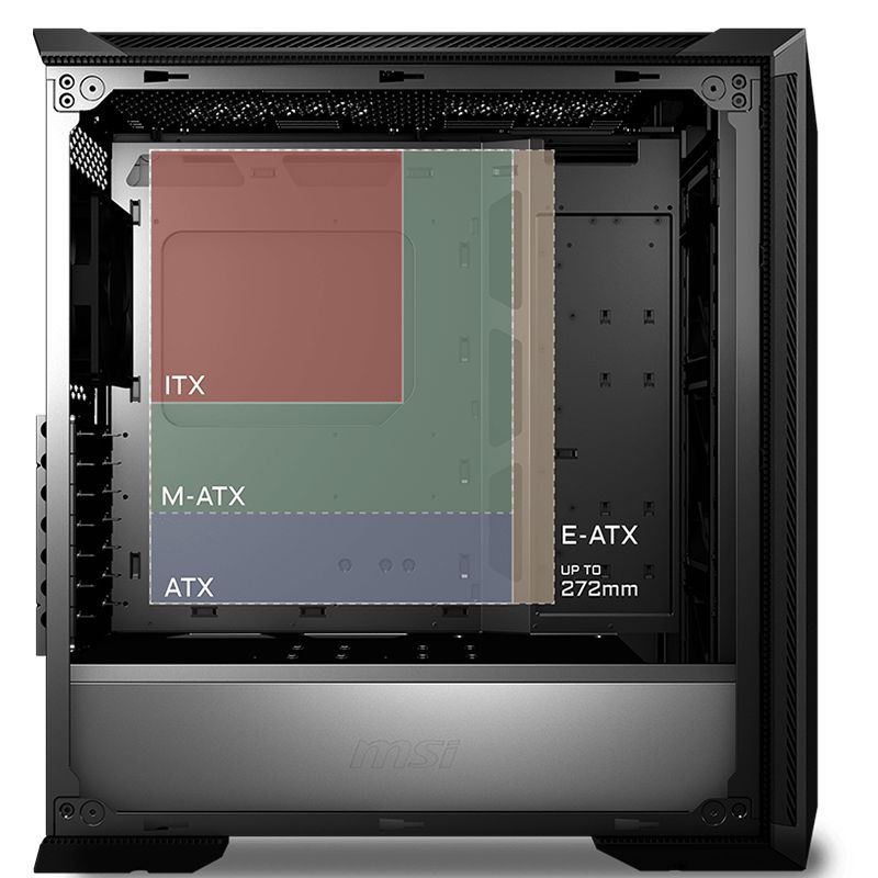 Descripción MSI MPG GUNGNIR 100P. Factor de forma: Midi-Tower, Tipo: PC, Color del producto: Negro. Diámetro de ventiladores frontales soportados: 140 mm, Ventiladores traseros instalados: 1x 120 mm, Diámetro de ventiladores traseros soportados: 120 mm. Tamaños de disco duro soportados: 2.5,3.5". Ancho: 227 mm, Profundidad: 510 mm, Altura: 525 mm