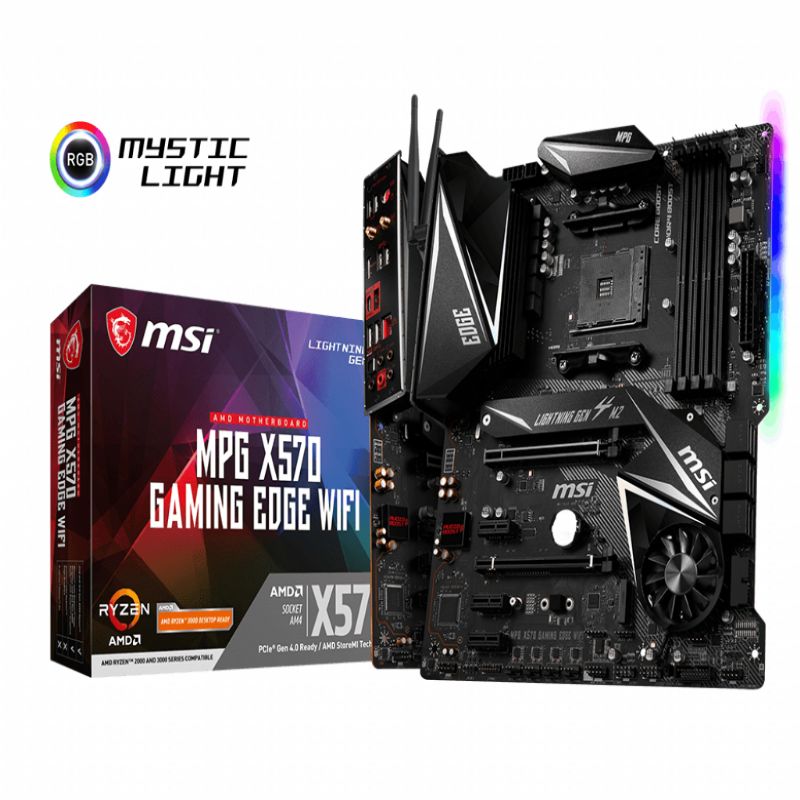Descripción MSI MPG X570 Gaming Edge WIFI. Fabricante de procesador: AMD, Socket de procesador: Zócalo AM4, Procesador compatible: AMD Ryzen. tipos de memoria compatibles: DDR4-SDRAM, Tipo de ranuras de memoria: DIMM, Velocidades de reloj de memoria soportadas: 1866,2133,2400,2666 MHz. Interfaces de disco de almacenamiento soportados: Serial ATA III. Soporte para proceso paralelo: 2-Way CrossFireX, Máxima resolución: 4096 x 2160 Pixeles. Tipo de interfaz ethernet: Gigabit Ethernet, Controlador LAN: Realtek RTL8111H, Wi-Fi estándares: 802.11a,802.11b,802.11g,Wi-Fi 4 (802.11n),Wi-Fi 5 (802.11ac)