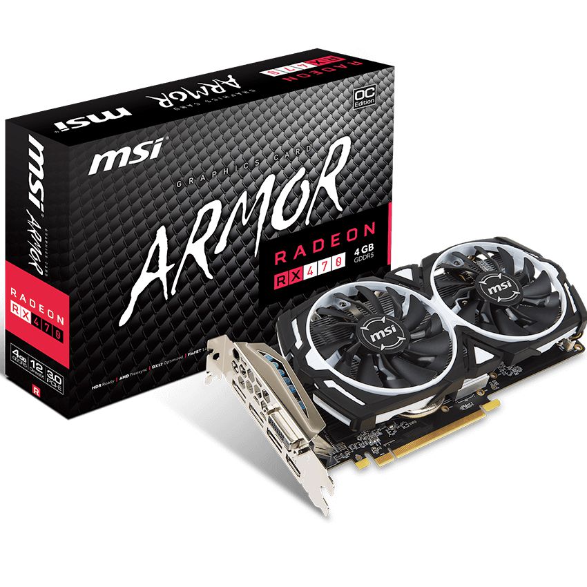 Descripción MSI Radeon RX 470 ARMOR 4G OC. Familia de procesadores de gráficos: AMD, Procesador gráfico: Radeon RX 470, Soporte para proceso paralelo: 2-Way CrossFireX. Tipo de memoria de adaptador gráfico: GDDR5. Tipo de interfaz: PCI Express 3.0, Versión HDMI: 2.0b. Tipo de enfriamiento: Activo, Color del producto: Negro, Color blanco. Conectores de energia suplementario: 1x 8-pin