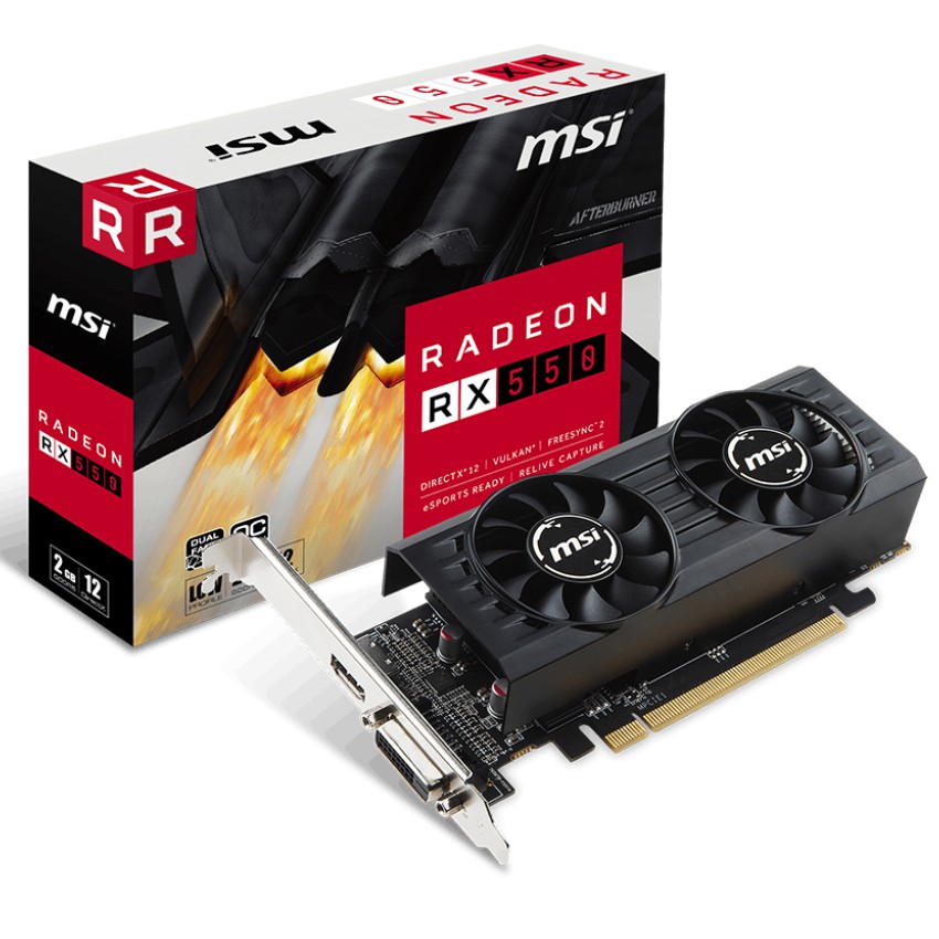 Especificaciones Model Name: Radeon? RX 550 2GT LP OC Graphics Processing Unit: Radeon? RX 550 Interface: PCI Express x16 (uses x8) Core Name: Polaris 12 Cores: 512 Units Core Clocks: Boost: 1203 MHz Memory Clock Speed: 7000 MHz Memory: 2GB GDDR5 Memory Bus: 128-bit Output: HDMI (Version 2.0) / DL-DVI-D HDCP Support: 2.2 Recommended PSU: 400 W Card Dimension(mm): 170 x 68 x 38 mm Weight (Card / Package): 276 g / 508 g Afterburner OC: Y DirectX Version Support: 12 OpenGL Version Support: 4.5 Maximum Displays: 2