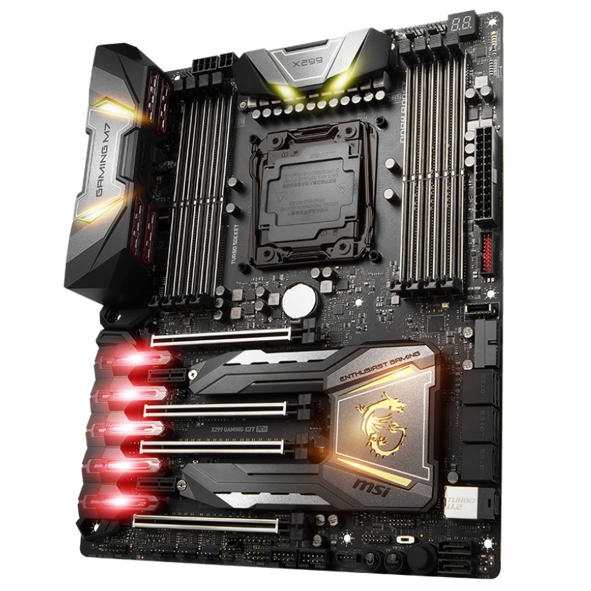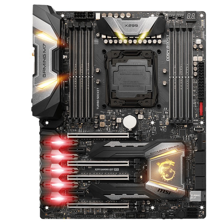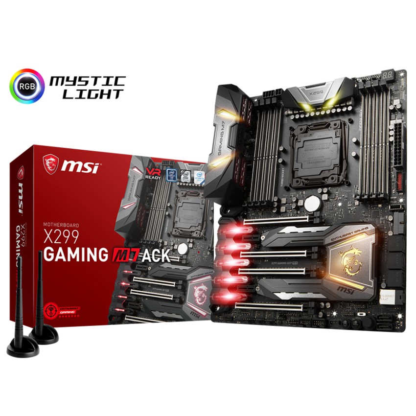Descripción MSI X299 GAMING M7 ACK. tipos de memoria compatibles: DDR4-SDRAM, Tipo de ranuras de memoria: DIMM, Velocidades de reloj de memoria soportadas: 2133,2400,2667,2800,2933,3000,3200,3333,3400,3466,3600,3733,3800,3866,4000,4133,4200,4266,4400,4500 MHz. Familia de procesador: Intel, Procesador compatible: Core i7,Core i7 Extreme Edition, Socket de procesador: LGA 2066. Controlador LAN: Killer E2500, Tipo de interfaz ethernet: Gigabit Ethernet, Wi-Fi estándares: IEEE 802.11a,IEEE 802.11ac,IEEE 802.11b,IEEE 802.11g,IEEE 802.11n. Componente para: PC, Familia de componentes de tarjeta madre: Intel, Circuito integrado de tarjeta madre: Intel X299. Soporte para proceso paralelo: 3-Way CrossFireX,3-Way SLI