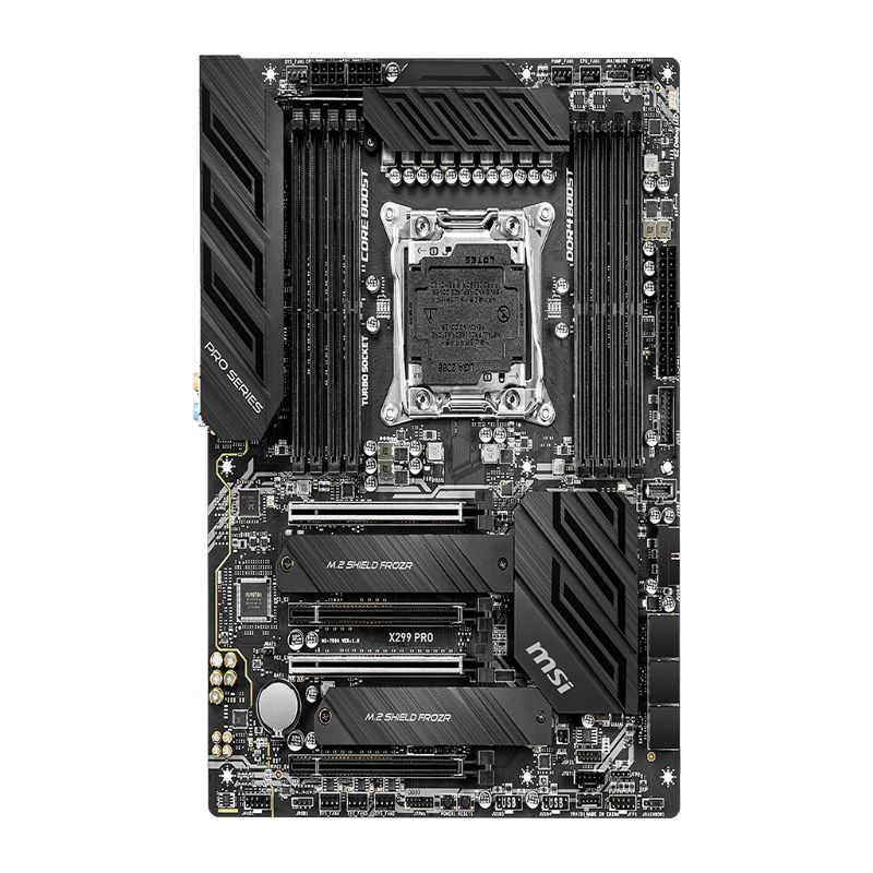 Descripción MSI X299 Pro. Fabricante de procesador: Intel, Socket de procesador: LGA 2066, Procesador compatible: Intel Core i9. tipos de memoria compatibles: LPDDR4-SDRAM, Tipo de ranuras de memoria: DIMM, Velocidades de reloj de memoria soportadas: 2133,2400,2667,2800,2933,3000,3200,3333,3400,3466,3600,3733,3800,3866,4000,4133,4200,4266,4400,4500. Soporte para proceso paralelo: 3-Way CrossFireX,3-Way SLI. Tipo de interfaz ethernet: Gigabit Ethernet, Controlador LAN: Intel® I219-V. Componente para: PC, Factor de forma: ATX, Familia del chipset: Intel