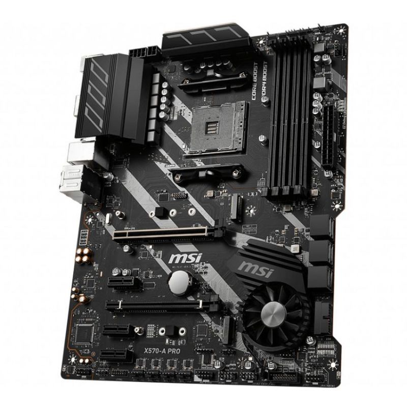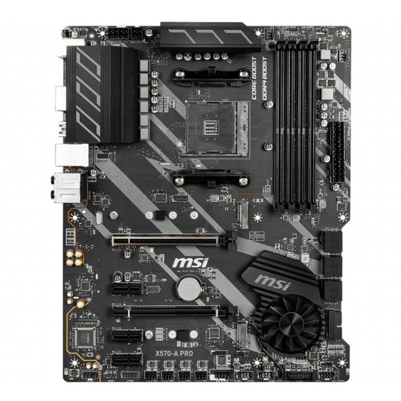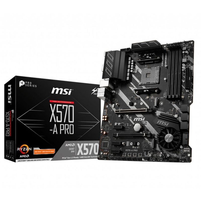 Descripción MSI X570-A PRO. Fabricante de procesador: AMD, Socket de procesador: Zócalo AM4, Procesador compatible: 2nd Generation AMD Ryzen™ 3, AMD Ryzen 3 3rd Gen, 2nd Generation AMD Ryzen™ 5, 3rd Generation.... tipos de memoria compatibles: DDR4-SDRAM, Tipo de ranuras de memoria: DIMM, Velocidades de reloj de memoria soportadas: 1866,2133,2400,2667,2800,2933,3000,3066,3200,3466,3600,3733,3866,4000,4133,4266,4400 MHz. Interfaces de disco de almacenamiento soportados: Serial ATA III. Soporte para proceso paralelo: 2-Way CrossFireX, Memoria máxima de adaptador de gráficos: 2048 MB, Máxima resolución: 4096 x 2160 Pixeles. Tipo de interfaz ethernet: Gigabit Ethernet, Controlador LAN: Realtek RTL8111H