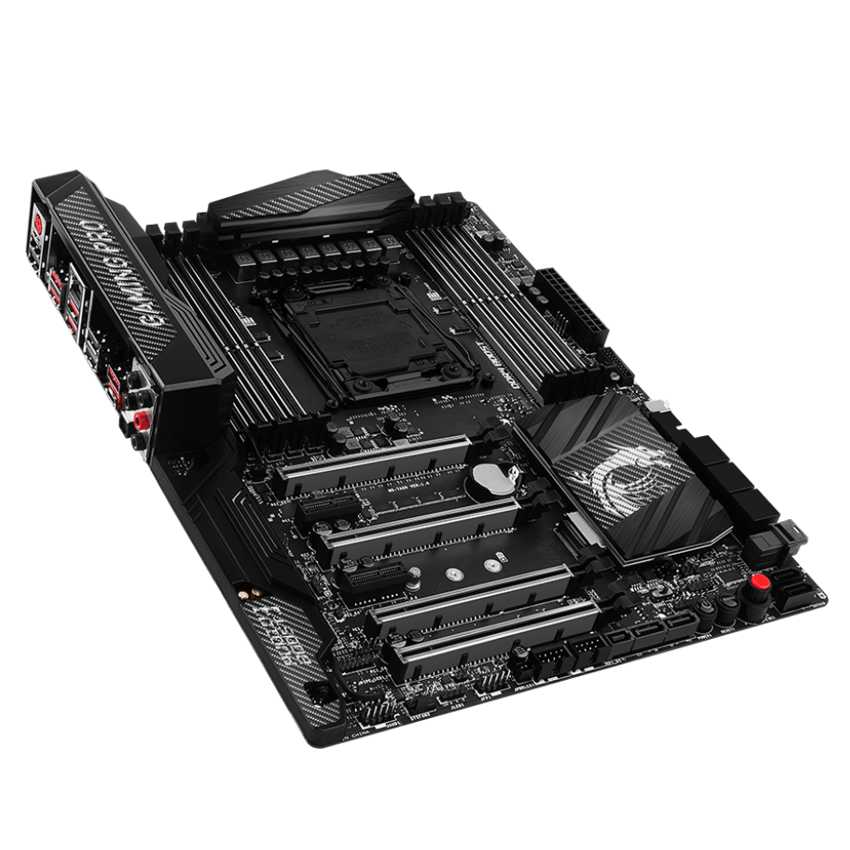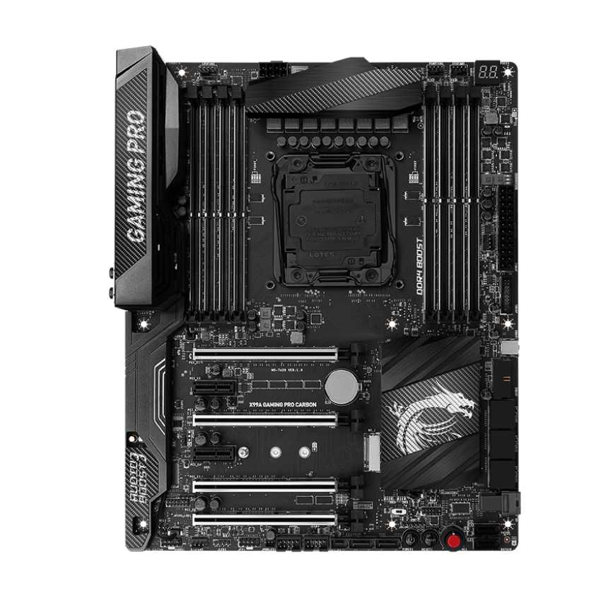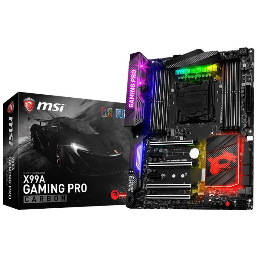 Descripción MSI X99A GAMING PRO CARBON. tipos de memoria compatibles: DDR4-SDRAM, Tipo de ranuras de memoria: DIMM, Canales de memoria: Cuadrángulo. Familia de procesador: Intel, Procesador compatible: Core i7, Socket de procesador: LGA 2011-v3. Interfaces de unidad de disco duro soportadas: M.2, Serial ATA III. Controlador LAN: Intel I218V. Componente para: PC, Familia de componentes de tarjeta madre: Intel, Circuito integrado de tarjeta madre: Intel X99