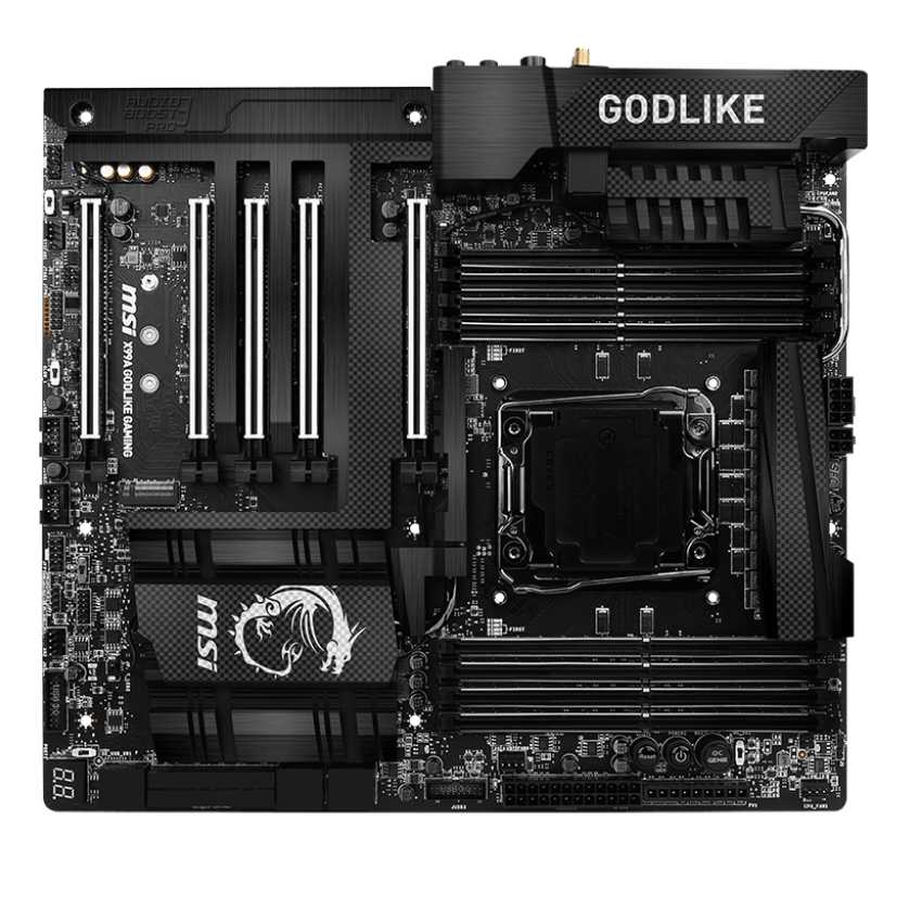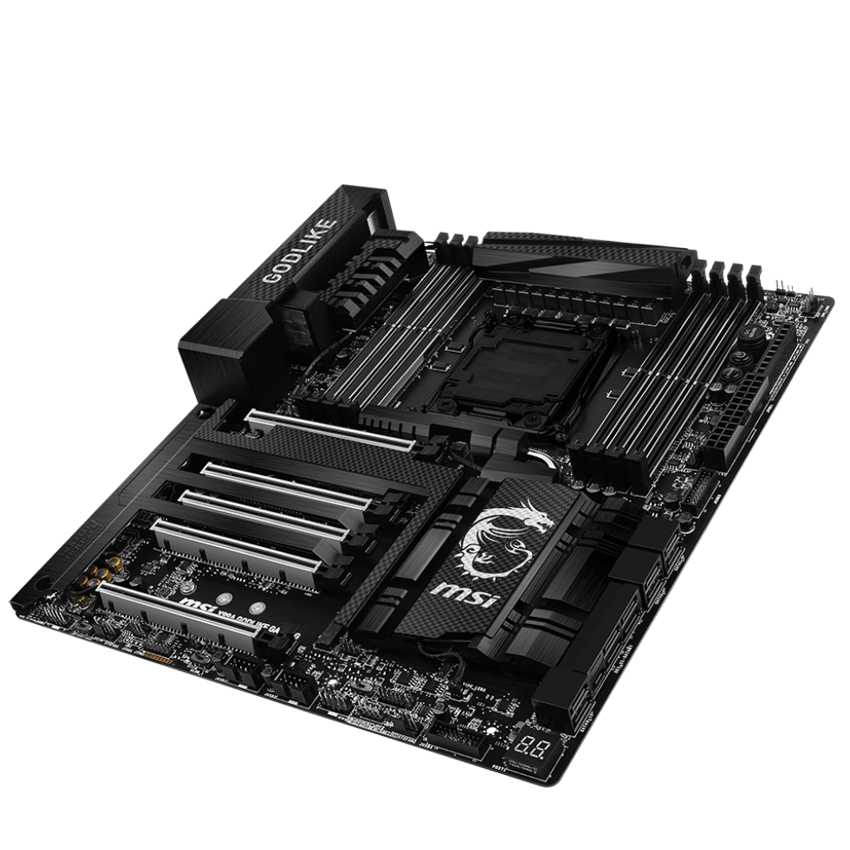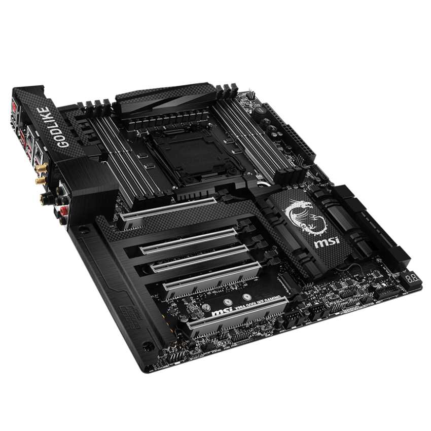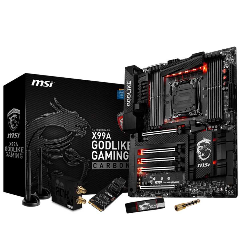 Descripción MSI X99A GODLIKE GAMING CARBON. tipos de memoria compatibles: DDR4-SDRAM, Tipo de ranuras de memoria: DIMM, Canales de memoria: Cuadrángulo. Familia de procesador: Intel, Procesador compatible: Core i7, Socket de procesador: LGA 2011-v3. Interfaces de unidad de disco duro soportadas: Serial ATA III. Controlador LAN: Atheros Killer E2400, Tipo de interfaz ethernet: Gigabit Ethernet, Wi-Fi estándares: IEEE 802.11a, IEEE 802.11ac, IEEE 802.11b, IEEE 802.11g, IEEE 802.11n. Componente para: PC, Familia de componentes de tarjeta madre: Intel, Circuito integrado de tarjeta madre: Intel X99