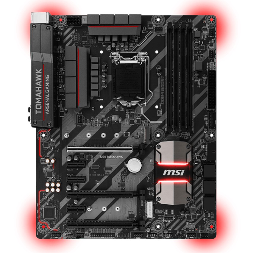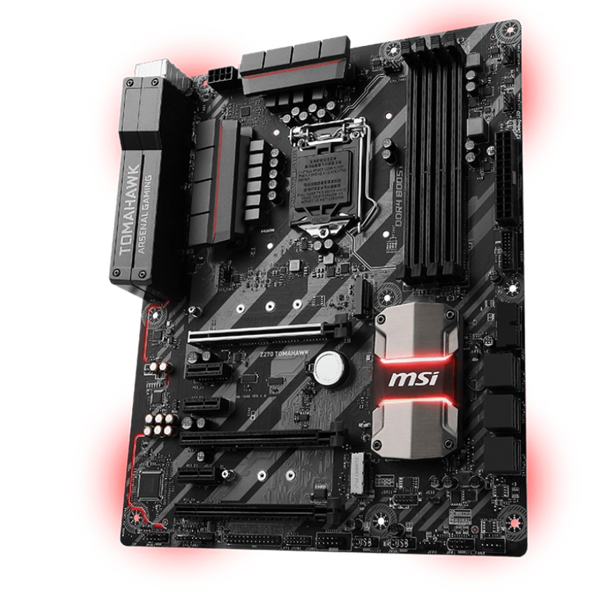 Descripción MSI Z270 TOMAHAWK. tipos de memoria compatibles: DDR4-SDRAM, Tipo de ranuras de memoria: DIMM, Velocidades de reloj de memoria soportadas: 2133,2400,2600,2800,3000,3200,3600,3800 MHz. Familia de procesador: Intel, Procesador compatible: Core i3,Core i5,Core i7, Socket de procesador: LGA 1151 (Socket H4). Controlador LAN: Intel I219-V. Componente para: PC, Familia de componentes de tarjeta madre: Intel, Circuito integrado de tarjeta madre: Intel Z270. Soporte para proceso paralelo: 2-Way CrossFireX, Máxima resolución: 4096 x 2160 Pixeles